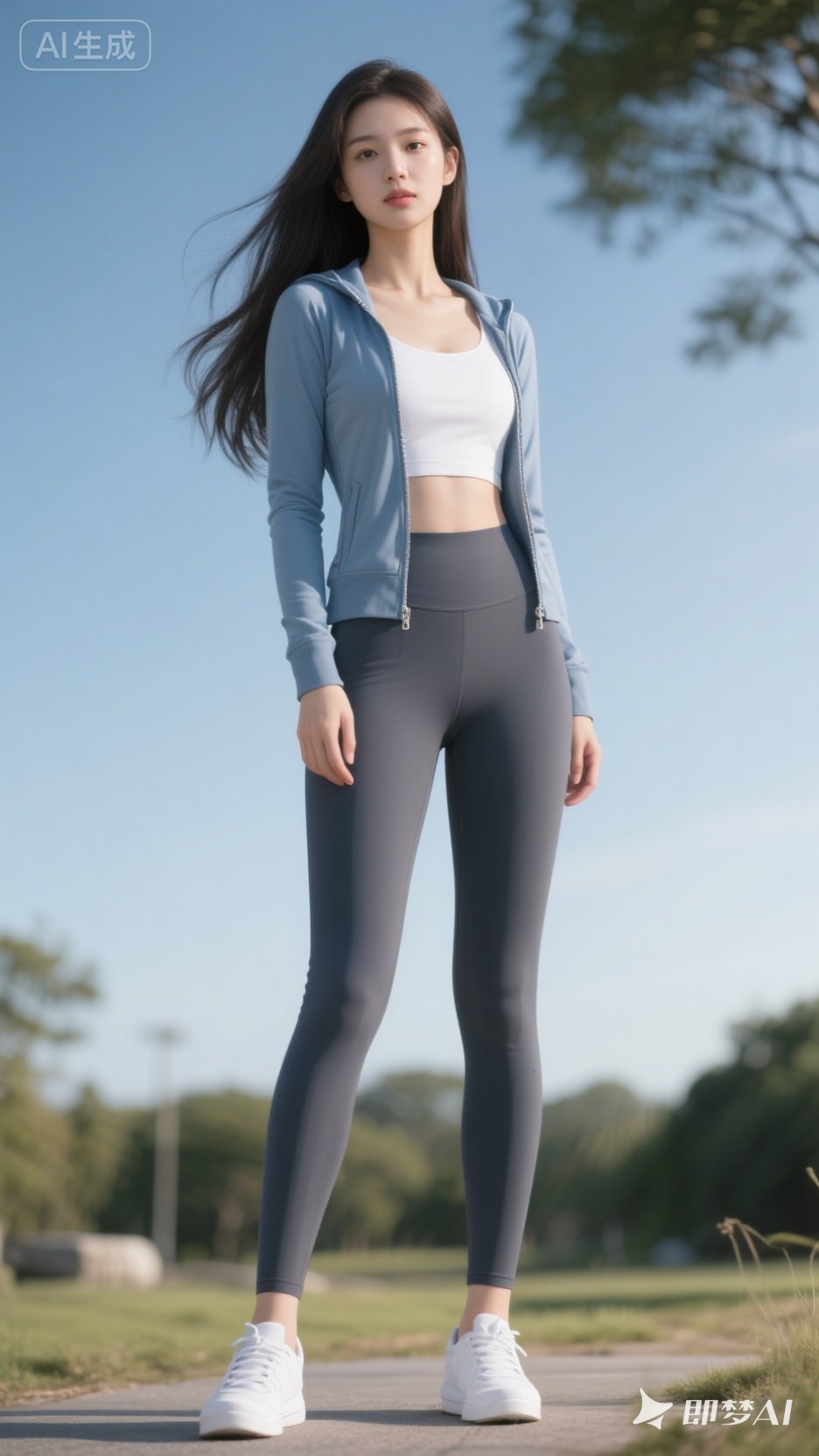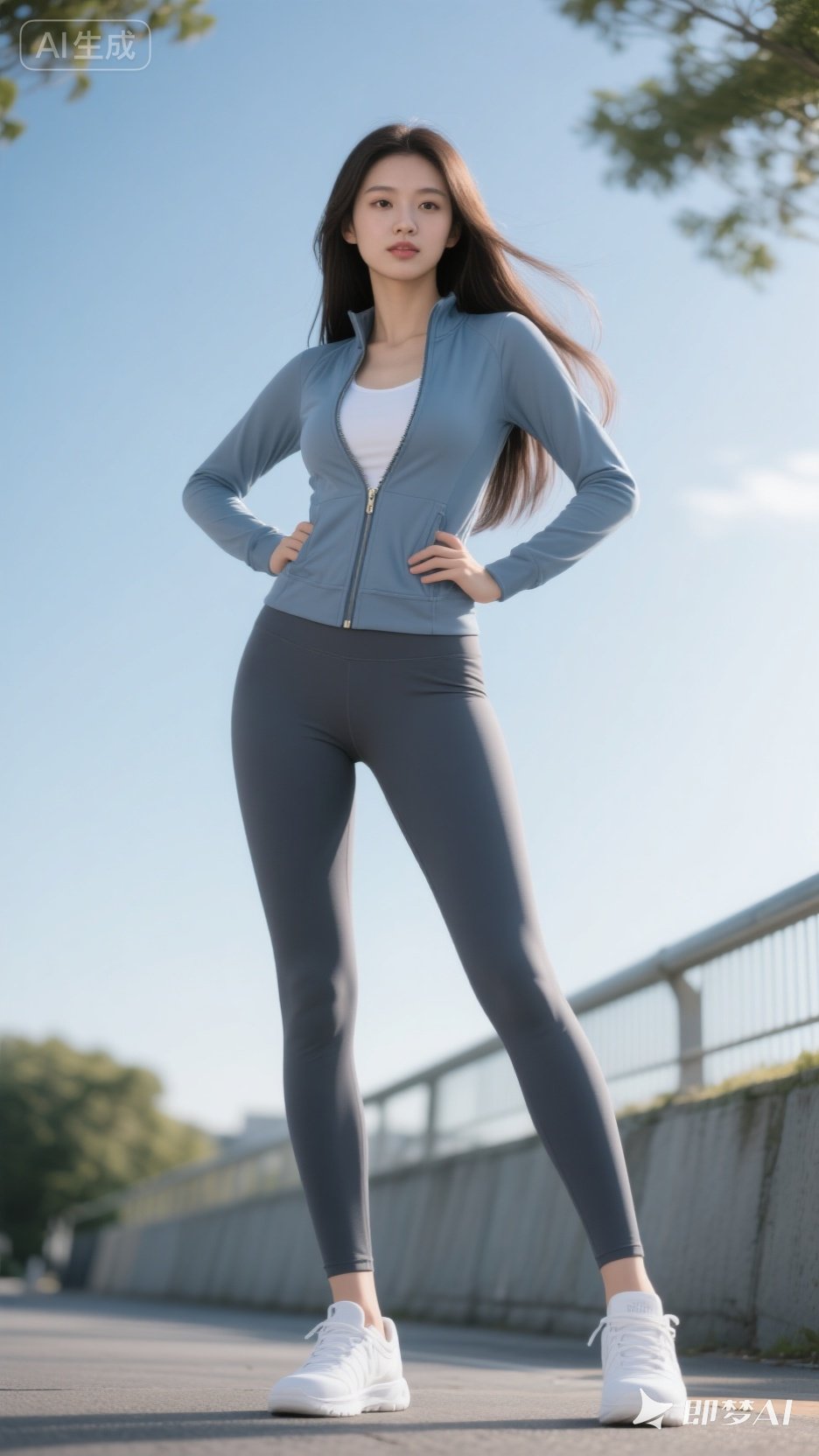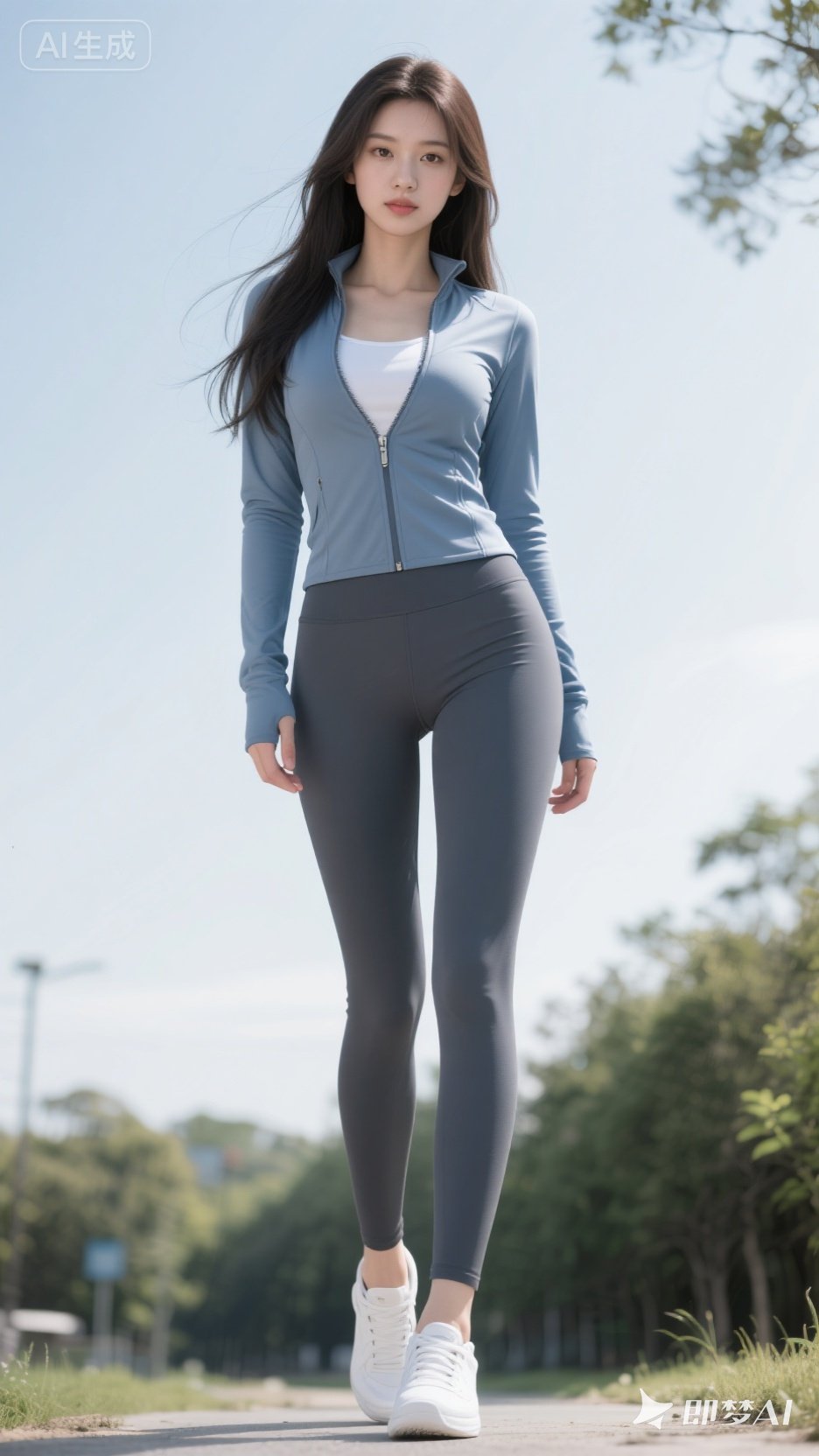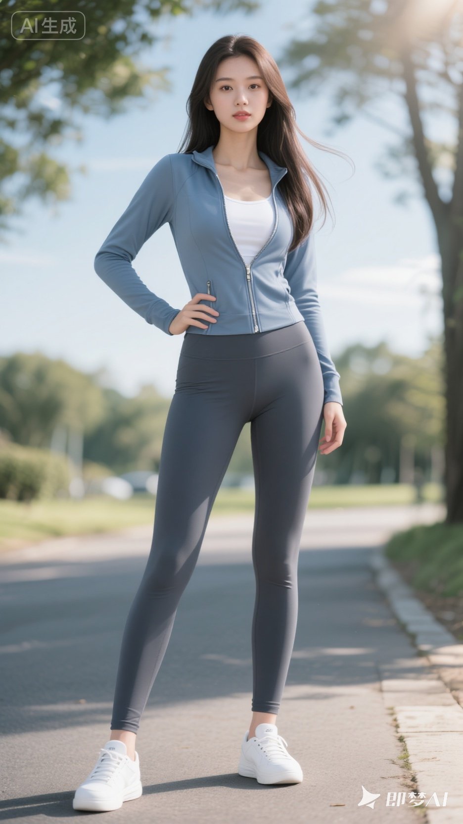 清晨的阳光洒在大地,穿着瑜伽裤搭配运动外套的清纯少女开启了元气满满的跑步锻炼。