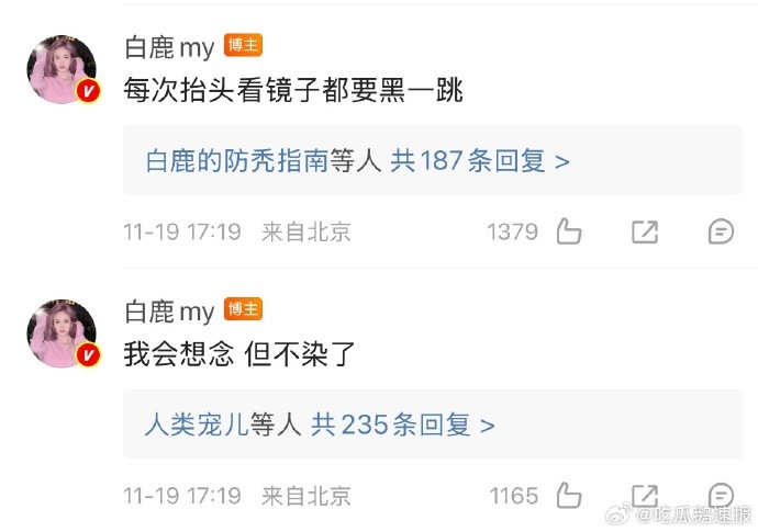 白鹿分享染发感受,“我会想念但是不染了” 的取舍背后,是 “每次看镜子都要黑一跳