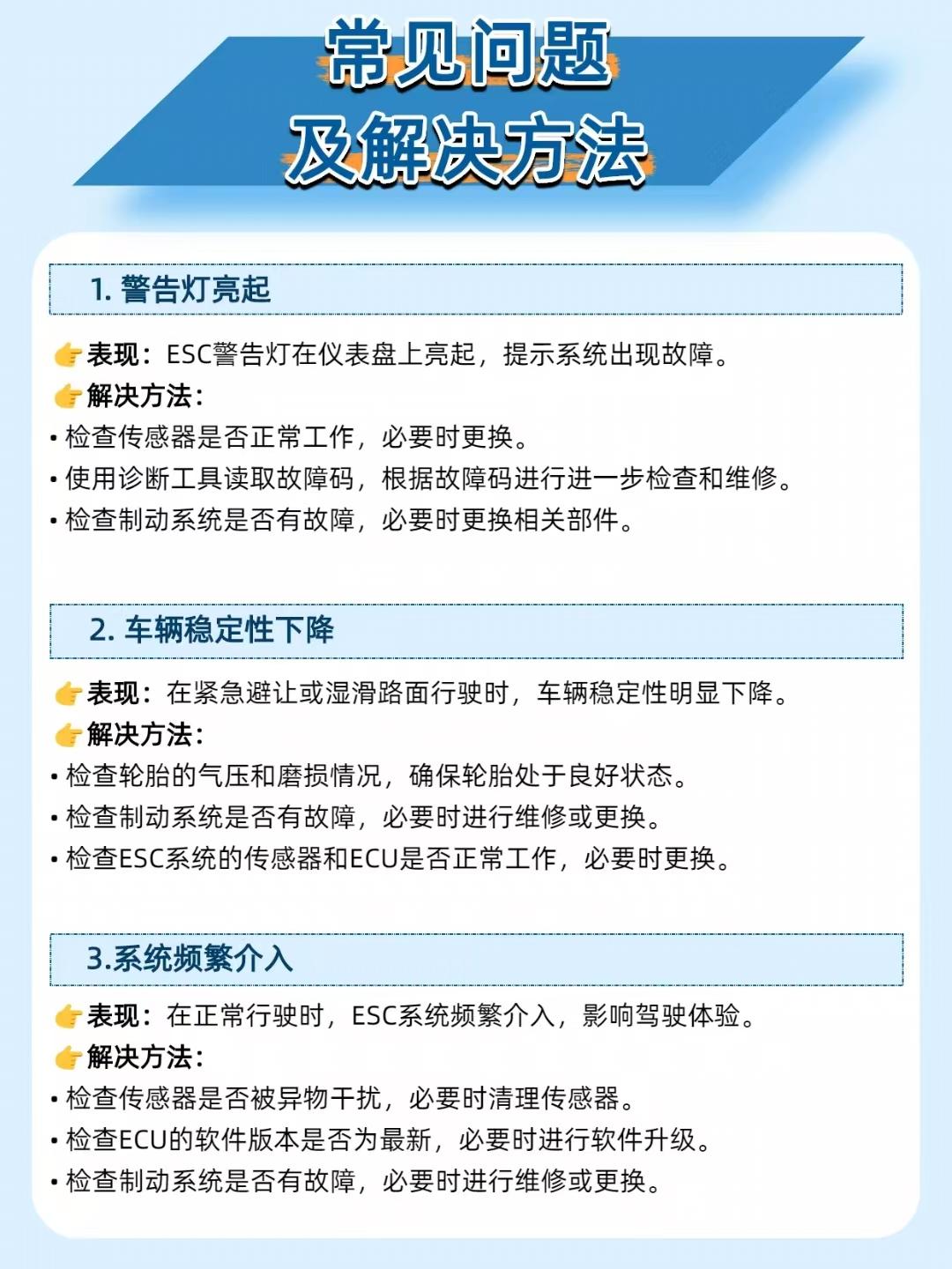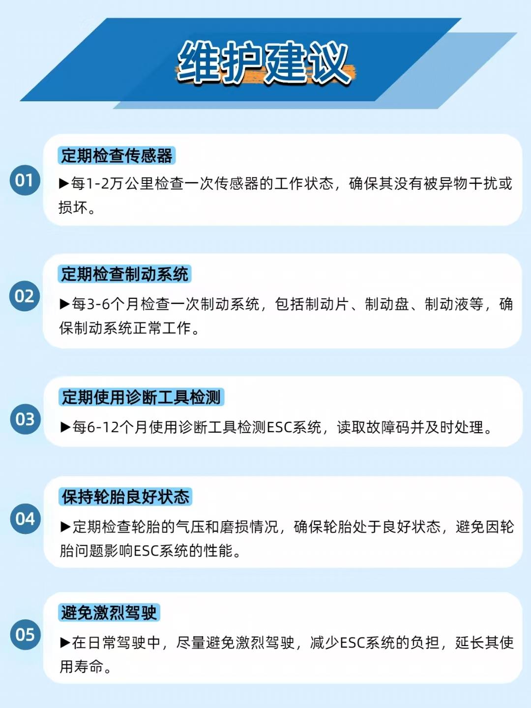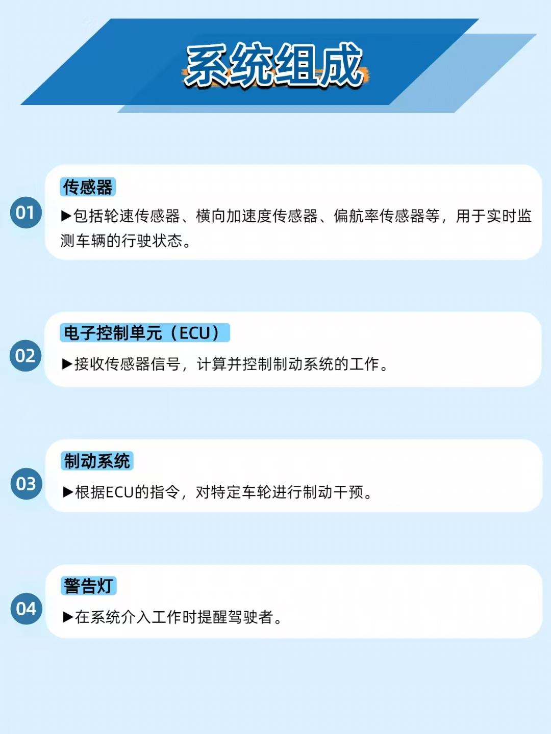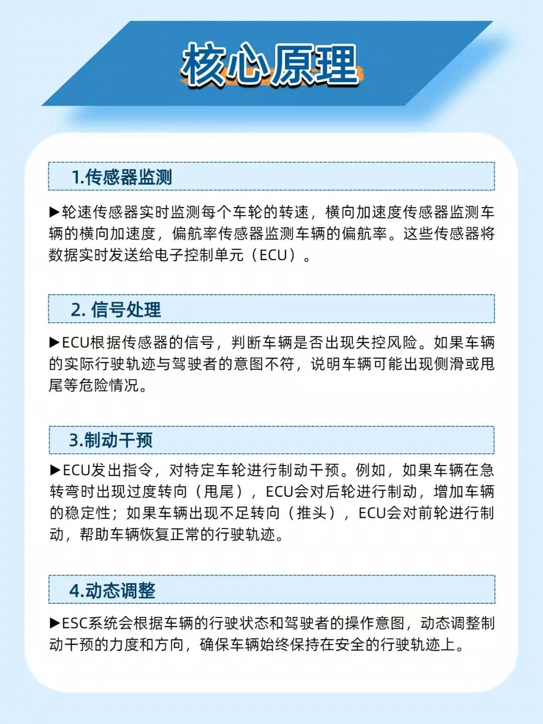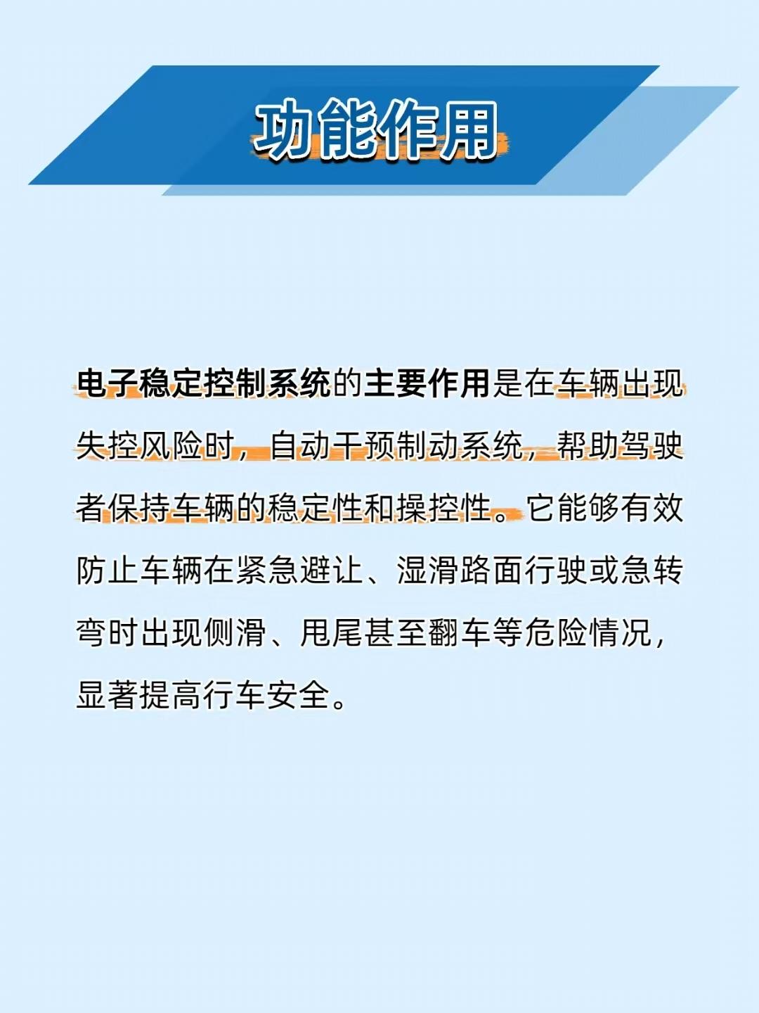 【雨天急弯不甩尾!汽车电子稳定控制系统 =“保命保镖”】 开车遇到湿滑路面、急打方向时,为啥车还能稳稳的?全靠汽车电子稳定控制系统(ESC)!它就像 “隐形保镖”,在车辆失控前自动干预制动,防止侧滑、甩尾甚至翻车,大幅提升行车安全。 _______________________________________________________________________ 🔧 系统组成:“感知 - 决策 - 执行” 三位一体 传感器:轮速、横向加速度、偏航率传感器组成 “感知网”,实时监控车辆状态; ECU(电子控制单元):系统 “大脑”,分析传感器数据,判断是否失控; 制动系统:接到指令后,对特定车轮施加制动,纠正行驶轨迹; 警告灯:系统介入时亮起,提示驾驶员。 _______________________________________________________________________ ⚙️ 核心原理:“预判 - 干预 - 调整” 无缝衔接 传感器监测:轮速传感器盯紧每个车轮转速,横向加速度传感器关注车辆侧倾,偏航率传感器监测行驶轨迹是否偏离; ECU 决策:一旦发现实际轨迹和驾驶员意图不符(比如要甩尾了),立刻计算干预方案; 制动干预:若车辆过度转向(甩尾),给后轮制动;若不足转向(推头),给前轮制动,把车辆 “拽” 回安全轨迹; 动态调整:持续根据行驶状态微调制动力度,确保全程稳定。 _______________________________________________________________________ ⚠️ 常见问题及解决:别等失控才重视 警告灯亮起:先查传感器是否故障,用诊断工具读故障码,再排查制动系统; 车辆稳定性下降:检查轮胎气压、磨损,制动系统是否正常,ESC 传感器和 ECU 也得排查; 系统频繁介入:清理传感器异物,升级 ECU 软件,检查制动系统。 _______________________________________________________________________ 📌 维护建议:让 “保镖” 时刻在线 每 1-2 万公里检查传感器,防止异物干扰; 每 3-6 个月检查制动系统(刹车片、盘、液); 每 6-12 个月用诊断工具检测 ESC,及时处理故障码; 保持轮胎良好状态,避免激烈驾驶,减少系统负担。 你感受到过 ESC 介入的 “微妙制动” 吗?评论区聊聊你的经历~