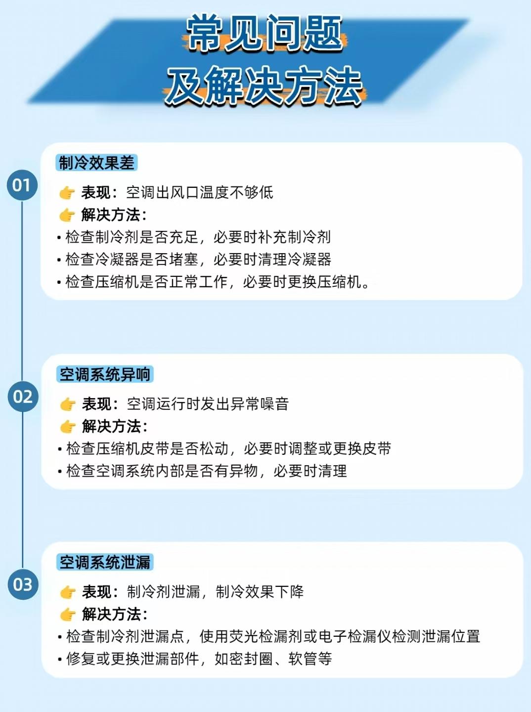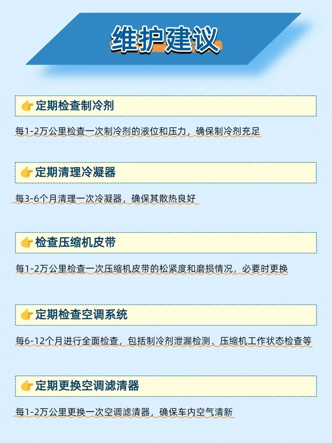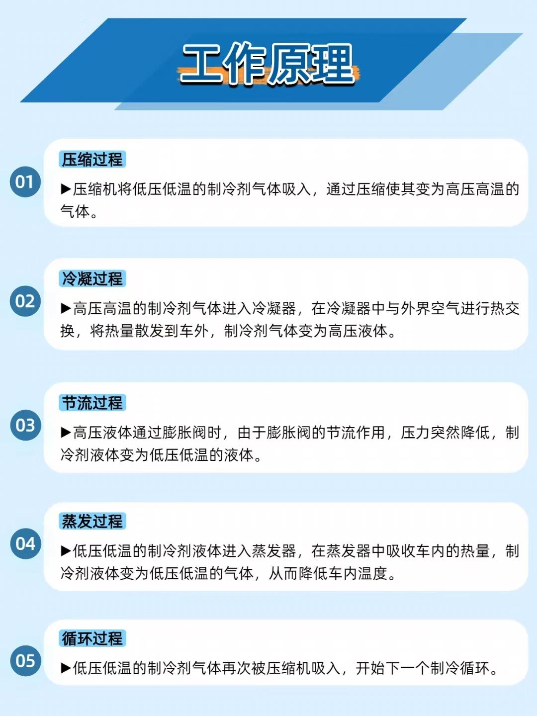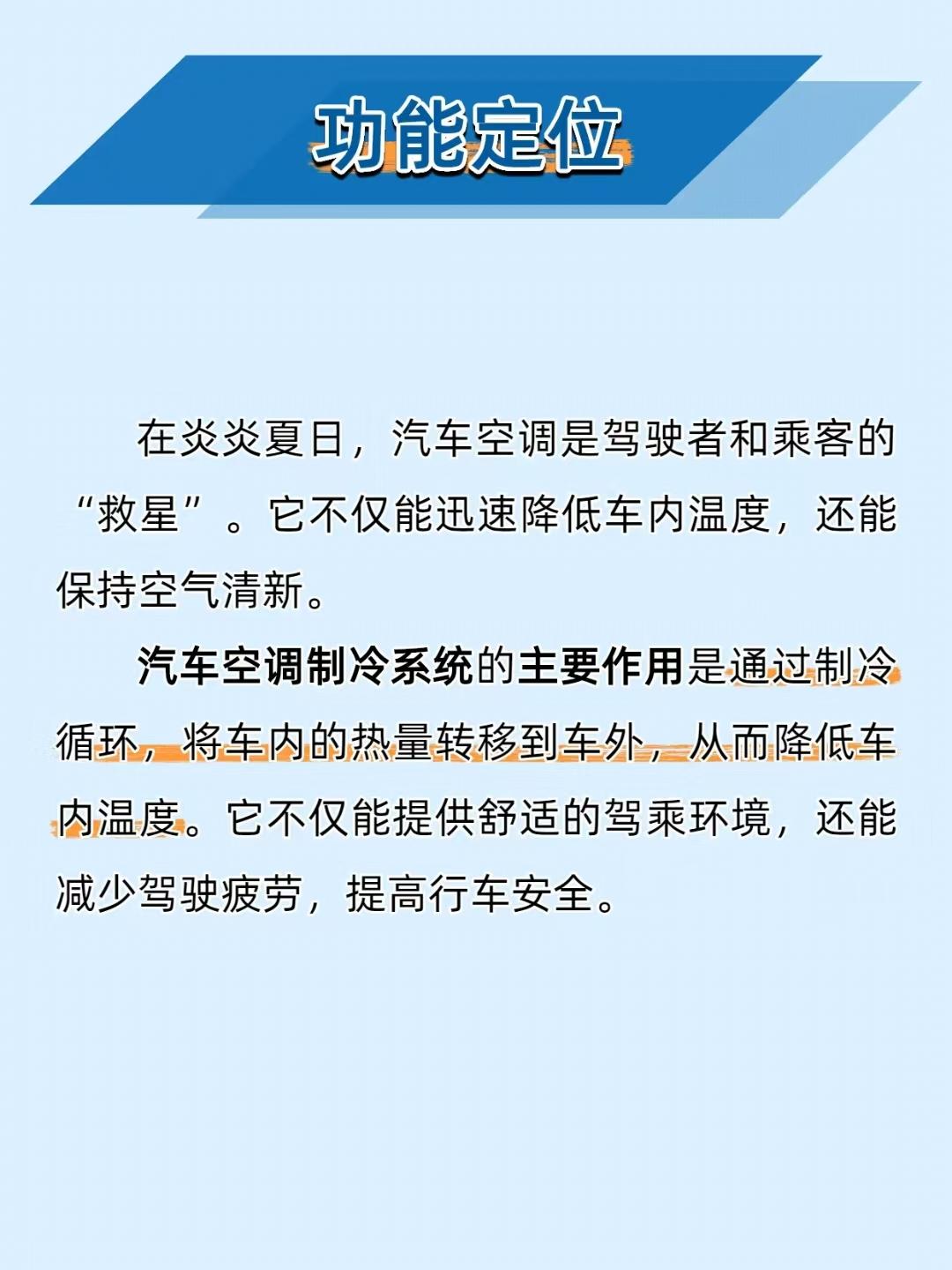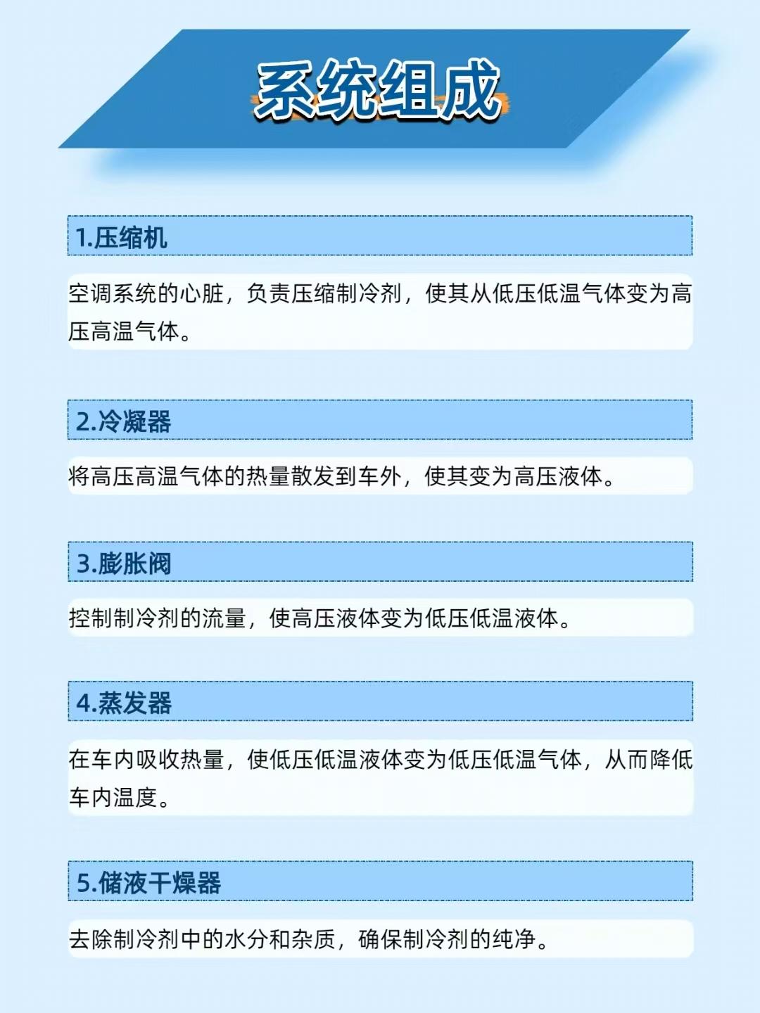【夏日开车全靠它续命!汽车空调制冷系统的 “降温黑科技” 太绝了】 炎炎夏日,汽车空调就是 “移动冰吧”!汽车空调制冷系统通过制冷循环把车内热量 “搬到” 车外,既能快速降温,又能保持空气清新,堪称夏日驾乘的 “救星”~ ——————————————————————————————————————————— 🔧 系统组成:五大部件组成 “降温天团” 压缩机:空调的 “心脏”,把制冷剂从低压低温气体压成高压高温气体; 冷凝器:给高压高温气体散热,让它变成高压液体; 膨胀阀:控制制冷剂流量,把高压液体变成低压低温液体; 蒸发器:在车内吸收热量,让低压低温液体变成气体,从而降低车内温度; 储液干燥器:过滤制冷剂里的水分和杂质,保证制冷纯净。 ——————————————————————————————————————————— ⚙️ 工作原理:“压缩 - 冷凝 - 节流 - 蒸发” 循环降温 压缩:压缩机把低压低温制冷剂气体压成高压高温气体; 冷凝:高压高温气体在冷凝器里散热,变成高压液体; 节流:高压液体经膨胀阀后压力骤降,变成低压低温液体; 蒸发:低压低温液体在蒸发器里吸收车内热量,变成气体,车内温度就降下来了; 循环:气体再被压缩机吸入,开始下一轮制冷。 ——————————————————————————————————————————— ⚠️ 常见问题及解决:别等空调罢工才重视 制冷效果差:先查制冷剂够不够,再看冷凝器堵没堵,压缩机是否正常; 空调异响:检查压缩机皮带松不松,系统里有没有异物; 制冷剂泄漏:用荧光检漏剂或电子检漏仪找漏点,修复或更换密封件、软管。 ——————————————————————————————————————————— 📌 维护建议:让 “冰吧” 长效制冷 每 1-2 万公里查制冷剂液位和压力,定期换空调滤清器; 每 3-6 个月清理冷凝器,确保散热好; 每 6-12 个月给空调做全面检查,包括泄漏检测、压缩机状态等。 你的汽车空调夏天够给力吗?评论区聊聊你遇到的空调问题~