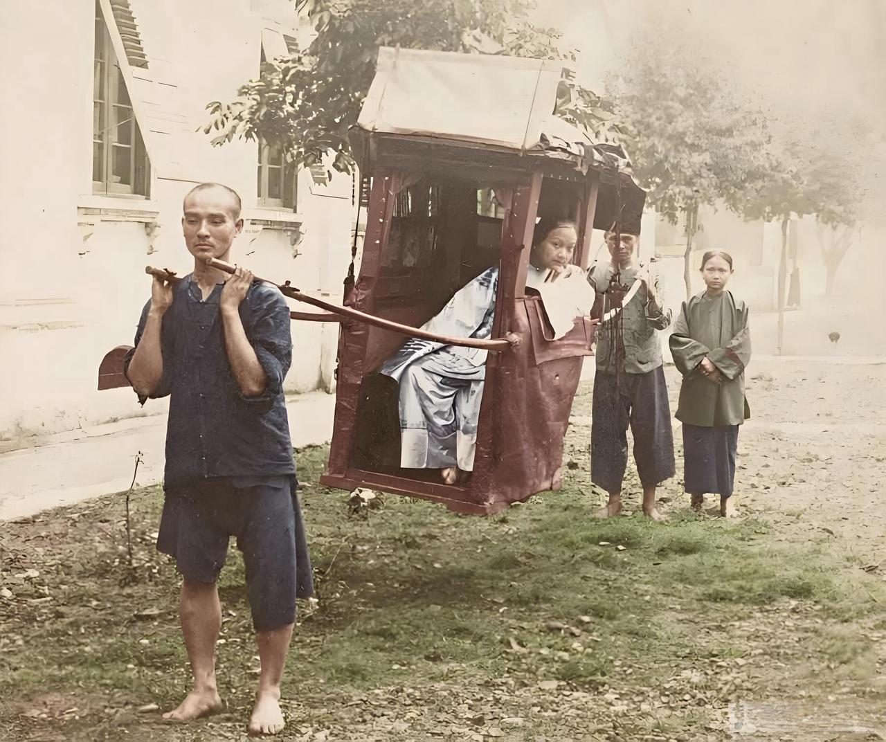 晚清广州,一位千金小姐端坐于装饰精巧的轿辇中,身着华服,尽显富家女的体面与优渥;两名轿夫赤脚抬轿,衣衫简朴,脚上老茧厚积——他们为节省开销故意不穿鞋,毕竟“鞋要花钱脚不用花钱”;随行的丫鬟同样未着鞋袜,且没有缠足(彼时缠足是富家女性的“身份符号”,底层女性因劳作需求保持天足)。这种出行方式在当时的花费,约等于如今三十多万的车辆。