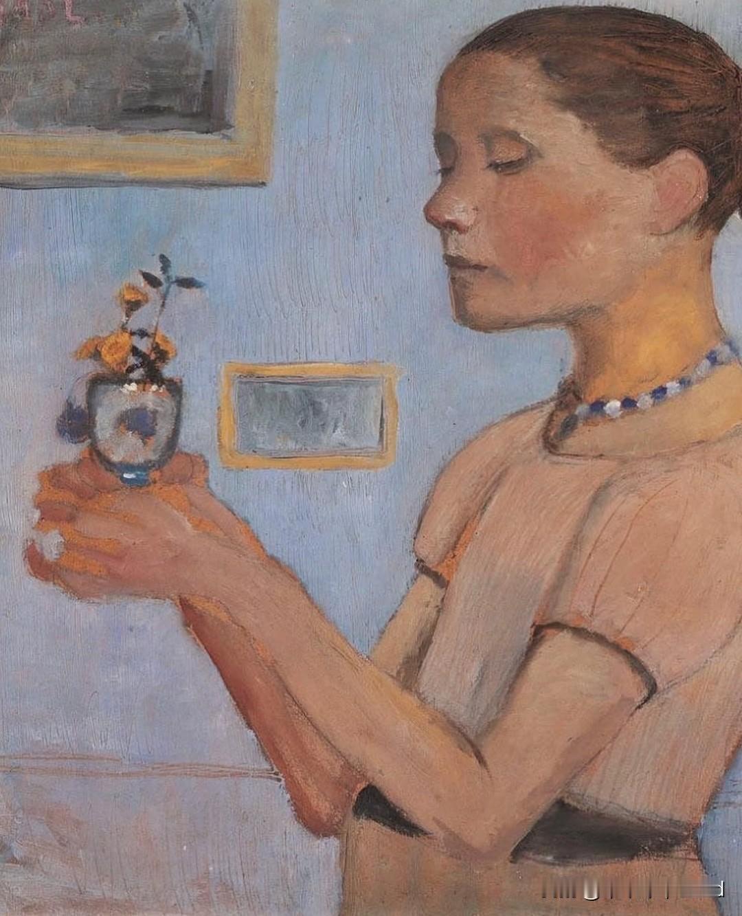 现在,越来越多的社会以为,彩礼高低和女性身价对等。让我们看看十九世纪出生的女性对独立和身价的认知。 在艺术史上,有一幅女艺术家的l体自画像《手持杏仁枝的自画像第六号》,突破了女性在艺术中通常只以被观看、被欲望的客体出现,她就是德国表现主义先驱探索者——保拉·莫德松·贝克。 油画 她将自身形象与自然(如手持花枝)联系在一起,赋予女性身体一种超越世俗的、近乎纪念碑式的永恒与生命力。画中的她,身躯健硕、姿态坦然,目光坚定直接望向画外,甚至带一丝疏离与沉思。她将自己既作为创作主体(画家),又作客体(模特),宣告女性拥有描绘和定义自身身体的权利。这不再是男性凝视下的身体,而是女性自我认知、自我肯定的身体。 保拉的婚姻中传统的妻子角色期望,与她想成为伟大艺术家的雄心产生激烈冲突;更重要的是两人艺术理念的不合拍。为了成为真正自己的自己,保拉出走了。正是因为这份出走巴黎,保拉终于实现了艺术突破,为德国表现主义开辟了一条注重内在情感与精神性,而非外在表象的道路,这才是真正的大女主。 女性,更是自己,女性最高等的身价只会是:卓越的才华与独特的灵魂。
