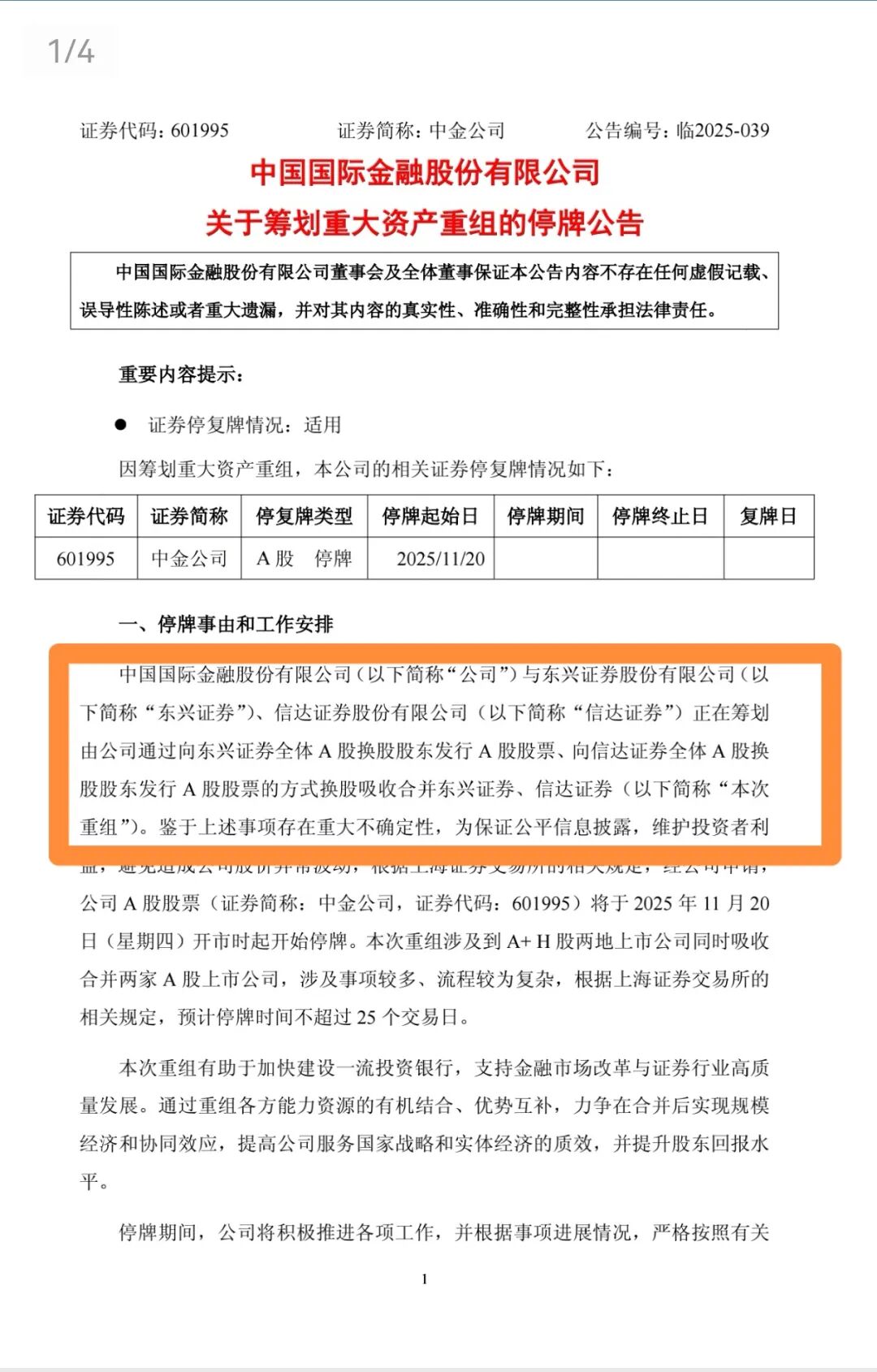 11月19日晚间,中金公司公告,公司与东兴证券、信达证券正在筹划由公司通过向东兴证券全体A股换股股东发行A股股票、向信达证券全体A股换股股东发行A股股票的方式换股吸收合并东兴证券、信达证券。鉴于事项存在重大不确定性,经申请,公司A股股票于2025年11月20日开市起停牌,预计不超25个交易日。11月19日,公司与两家被吸并方签署《合作协议》,本次重组尚需三方董事会、股东会审议及监管机构批准,存在不确定性。