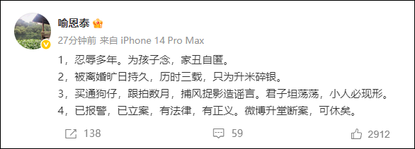 今晚,演员喻恩泰在其个人社媒发文回应近期离婚风波: