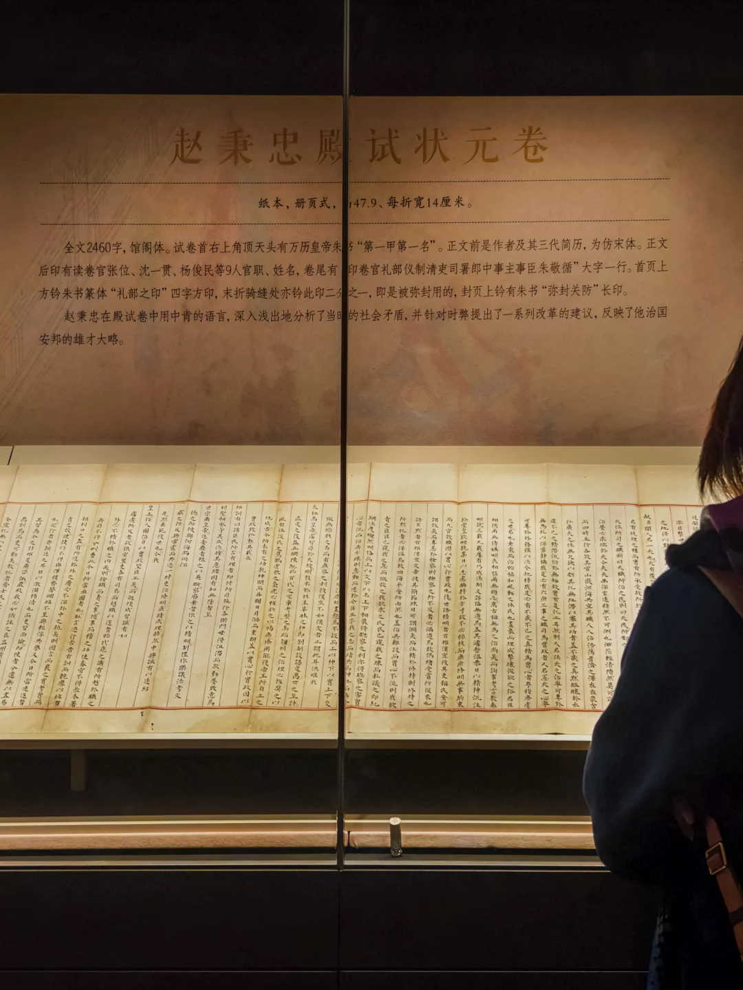 2️⃣赵秉忠状元卷(展馆二楼):唯一存世的科举考试状元卷,字迹工整,全文2460字无一涂改