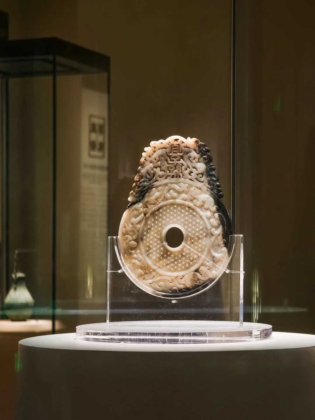 1️⃣ 东汉宜子孙玉璧(展馆二楼):上等和田玉雕刻而成,目前国内唯一刻有汉字的汉代大型玉璧