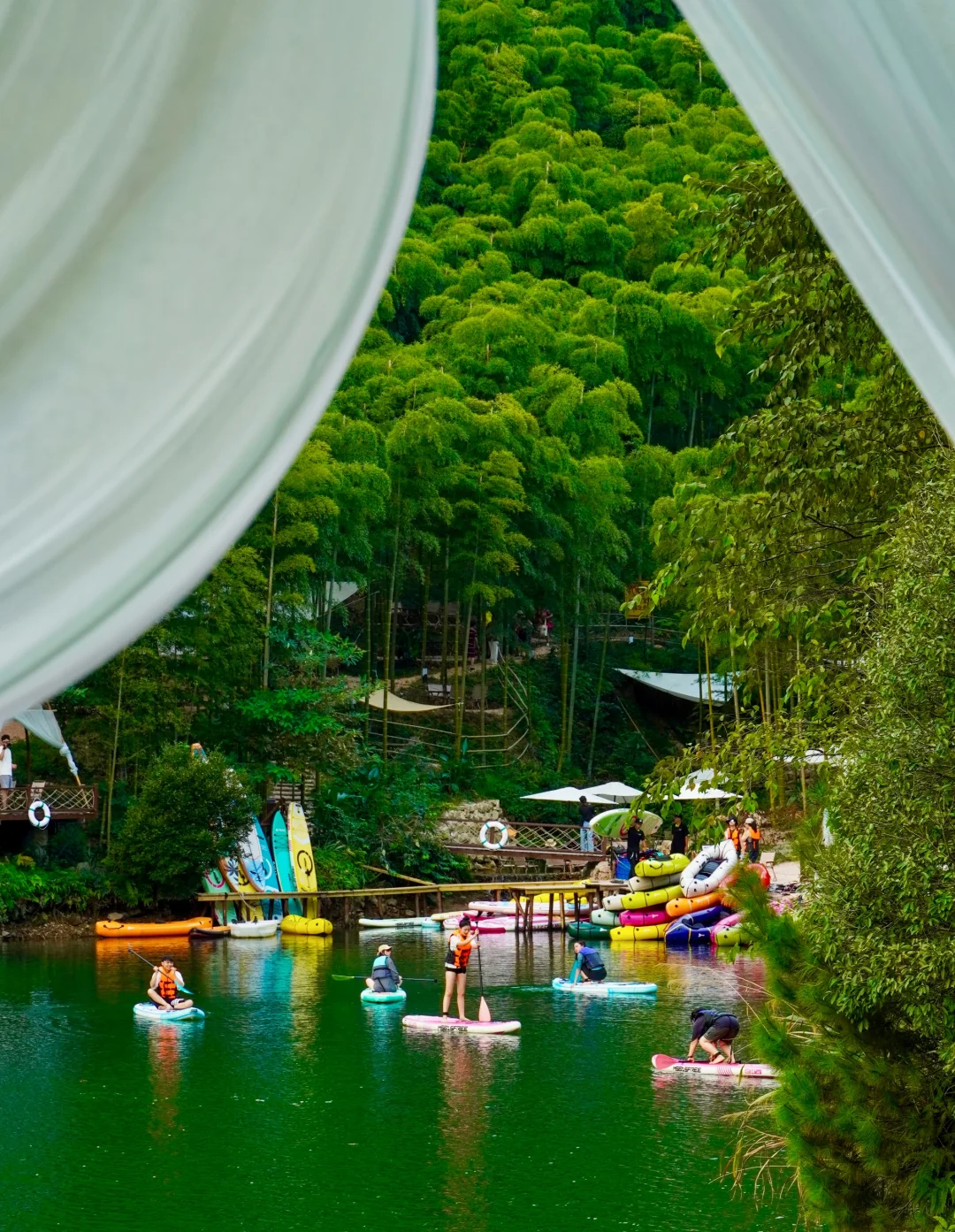 在湖边玩桨板、皮划艇