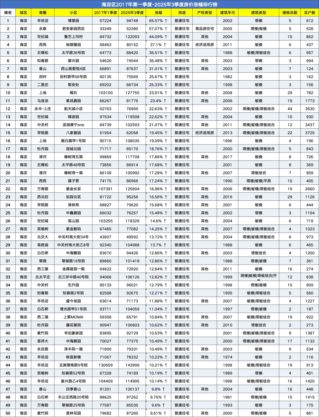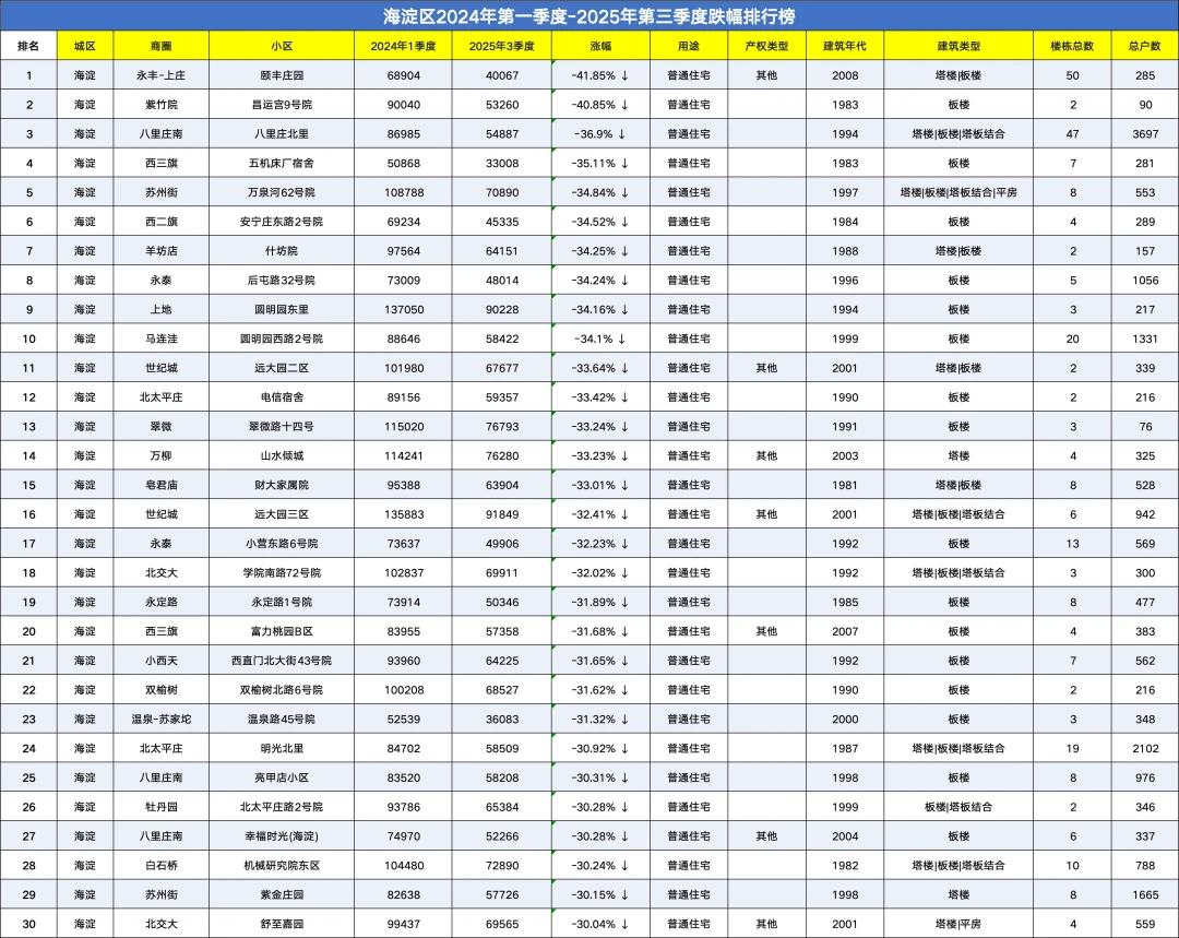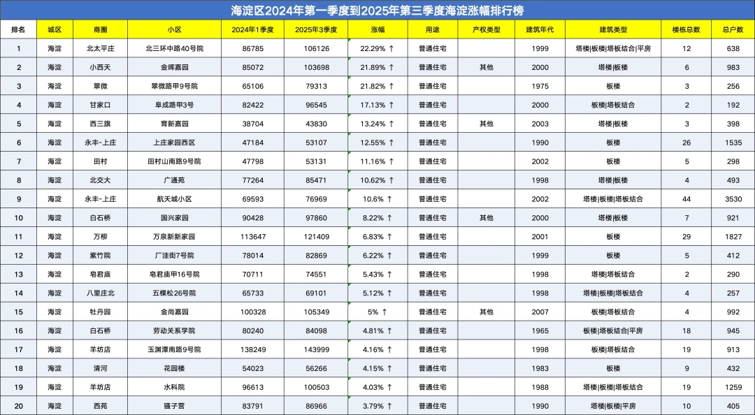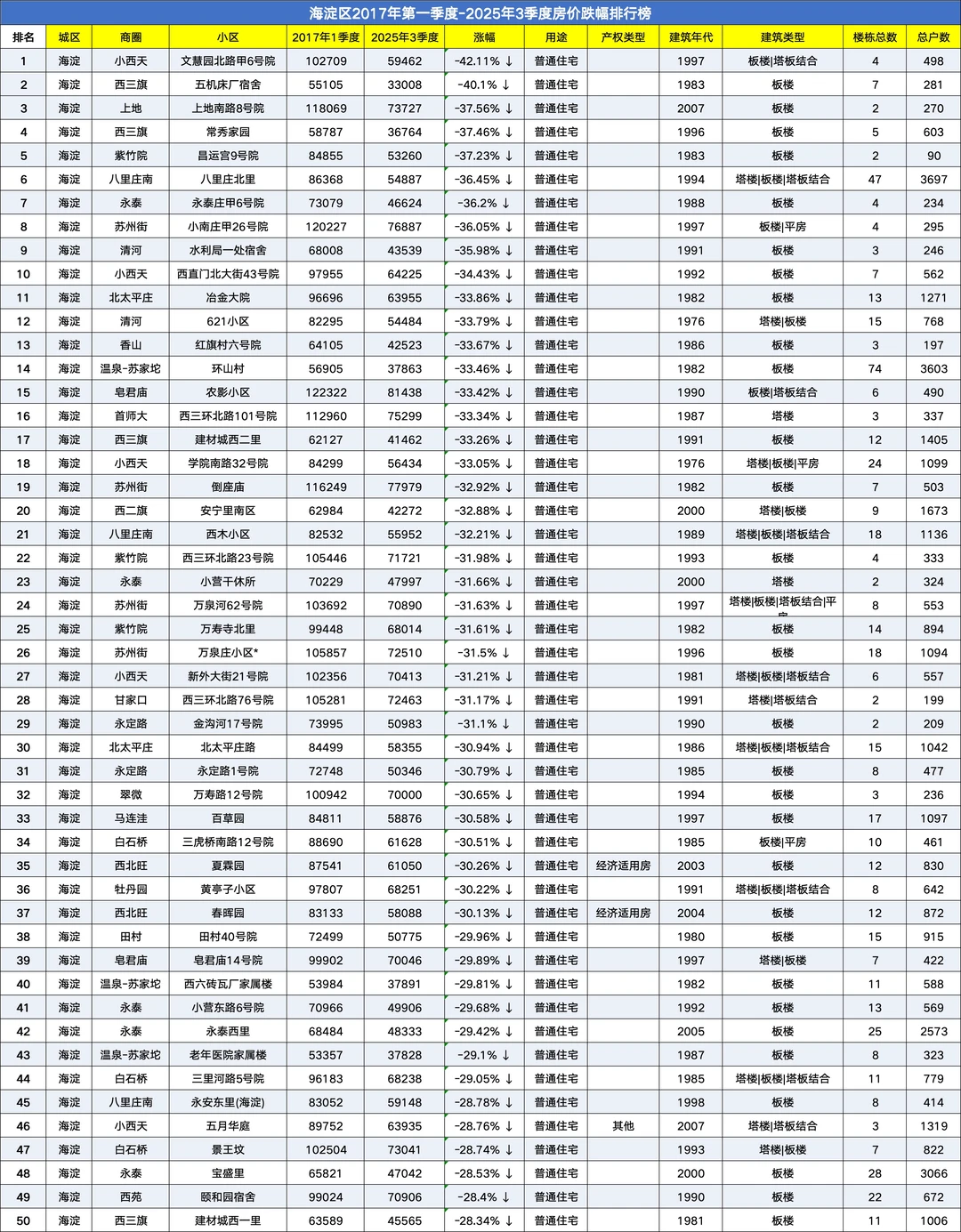 [气球R] 经过上一轮的房价下调,北京最抗跌的海淀,也因为教育集团化、房产老龄化和新房的挤压开始出现价格分化。这篇文章,我整理了2017年-2025年北京海淀区二手房房价涨跌排行榜,和2024年第一季度-2025年第三季度的涨跌排行榜。 [气球R] 从这两组数据的对比中,大家能看出来哪些片区的房子是真正抗跌的,哪些片区的房子走势下行。涨幅最高的小区,都是改善型住宅,可见海淀购买力最强的依旧是改善群体。 [气球R] 从跌幅数据来看,建筑年代在2005年以前的房子,占比超过60%。比如小西天和北太平庄,即便是在三环附近,也因为房龄老、学区属性弱,成为跌幅最高的片区之一。 [气球R] 这也是最近两年海淀新房火热的原因,海淀的产业本来就在北五环,从生活范围来看,大家没必要一定去五环内买一套老房子。 [气球R] 功德寺、永丰南等五环外的新房,品质高、价格也在10万/㎡左右,和五环内二手房价格差的不太多。 [气球R] 很多家庭就愿意为了品质,买新房。未来随着海淀教育集团化继续深耕,海淀内部的老破小,也会面临有价无市的局面。 [气球R] 其实从2024年到今年的房价浮动,跌幅最大的主要还是居住品质差的老小区和距离地铁远的小区。海淀,没有地铁,寸步难行。 [气球R] 其次就是学区,海淀的学区对房价影响非常大,但海淀又太卷太卷了,卷完学区房,还得卷家长的陪伴和鸡娃。 [气球R] 对于当前的楼市行情,大家会发现历史是相似的:有品质的、圈层高的改善房,始终都是有钱人来承接,即便是楼市经历了涨幅周期,长期来看也是抗跌的。 [气球R] 而老破小、远大新,对标的是刚需群体。刚需群体的特点是压力大了我就晚点买,房东也更容易抛售这类房产。这类房子,是价格波动最大的,也是最不抗跌的。 [气球R] 未来的北京楼市,分化还会继续。大家现在要做的,是明哲保身守护资产,冒险激进的时代已经过去了。