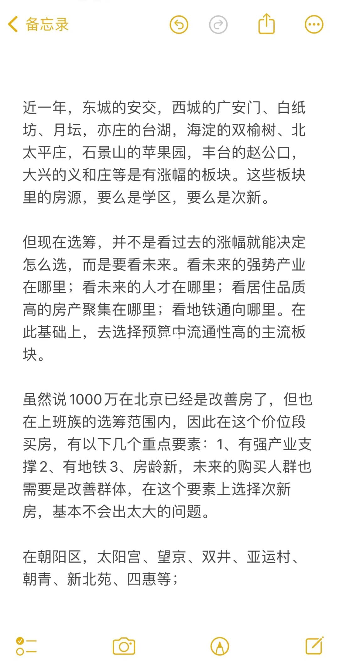 [气球R] 虽然说1000万在北京已经是改善房了,但也在上班族的选筹范围内,因此在这个价位段买房,有以下几个重点要素:1、有强产业支撑 2、有地铁 3、房龄新,未来的购买人群也需要是改善群体,在这个要素上选择次新房,基本不会出太大的问题。