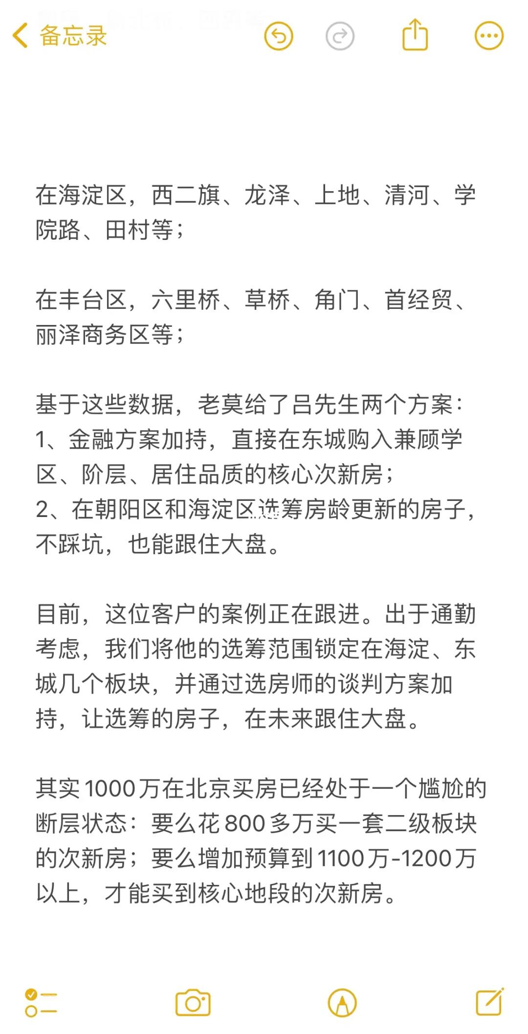 [气球R] 其实1000万在北京买房已经处于一个尴尬的断层状态,要么花800多万买一套二级板块的次新房;要么增加预算到1100万-1200万以上,才能买到核心地段的次新房。