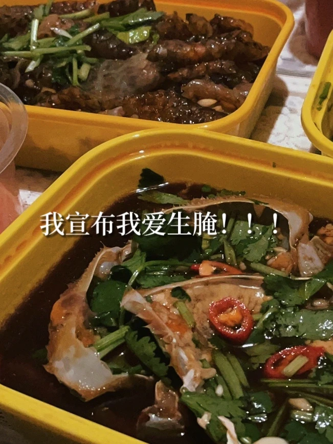 6⃣️我之前是从不吃生腌的人,在深圳尝试过几次都觉得不喜欢,但在汕头连续点了两晚的生腌外卖夜宵,“金二顺”和“瑞娇嫲嫲”都很新鲜,尤其是三目蟹,果冻口感真的绝了[皱眉R]