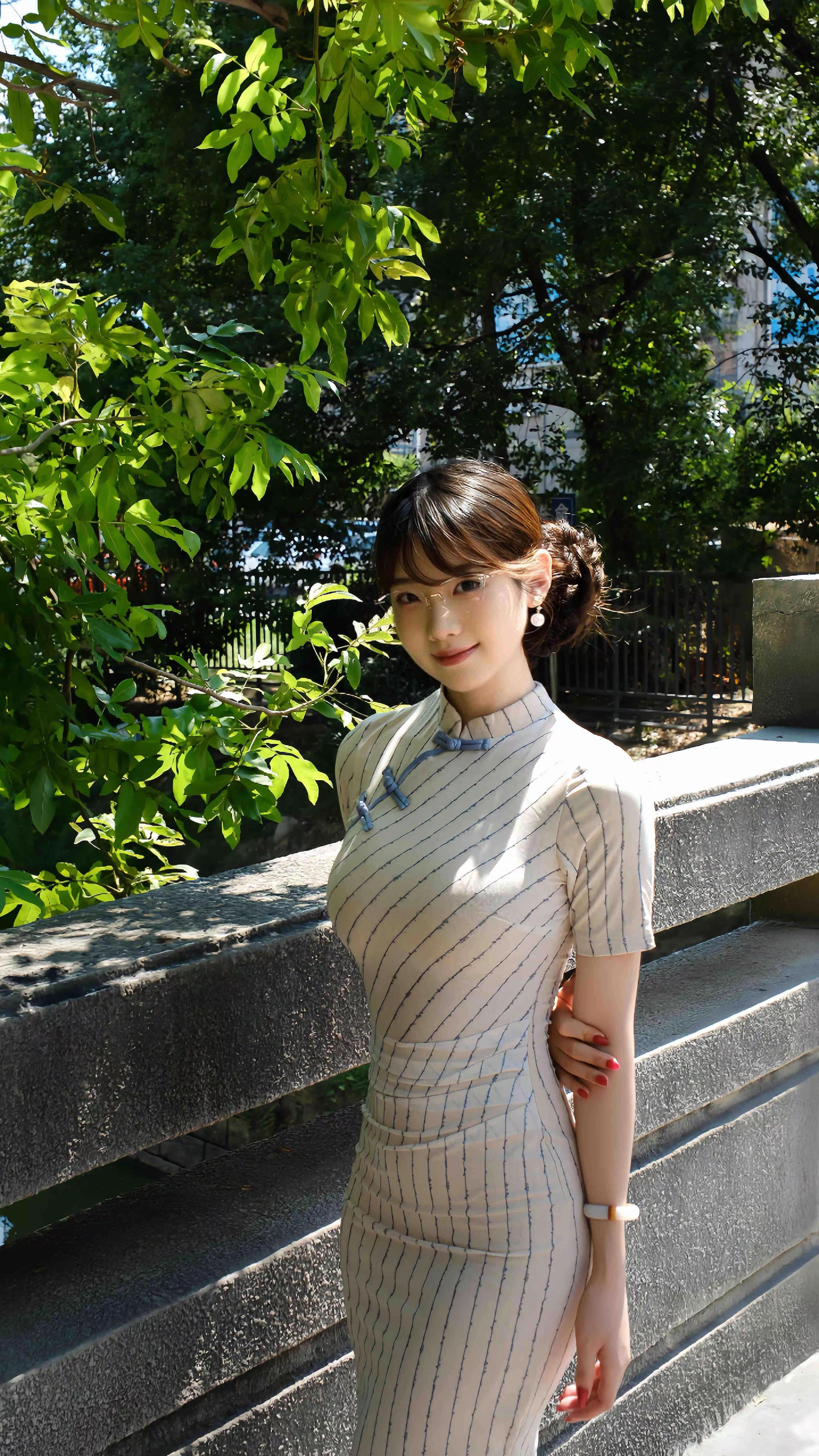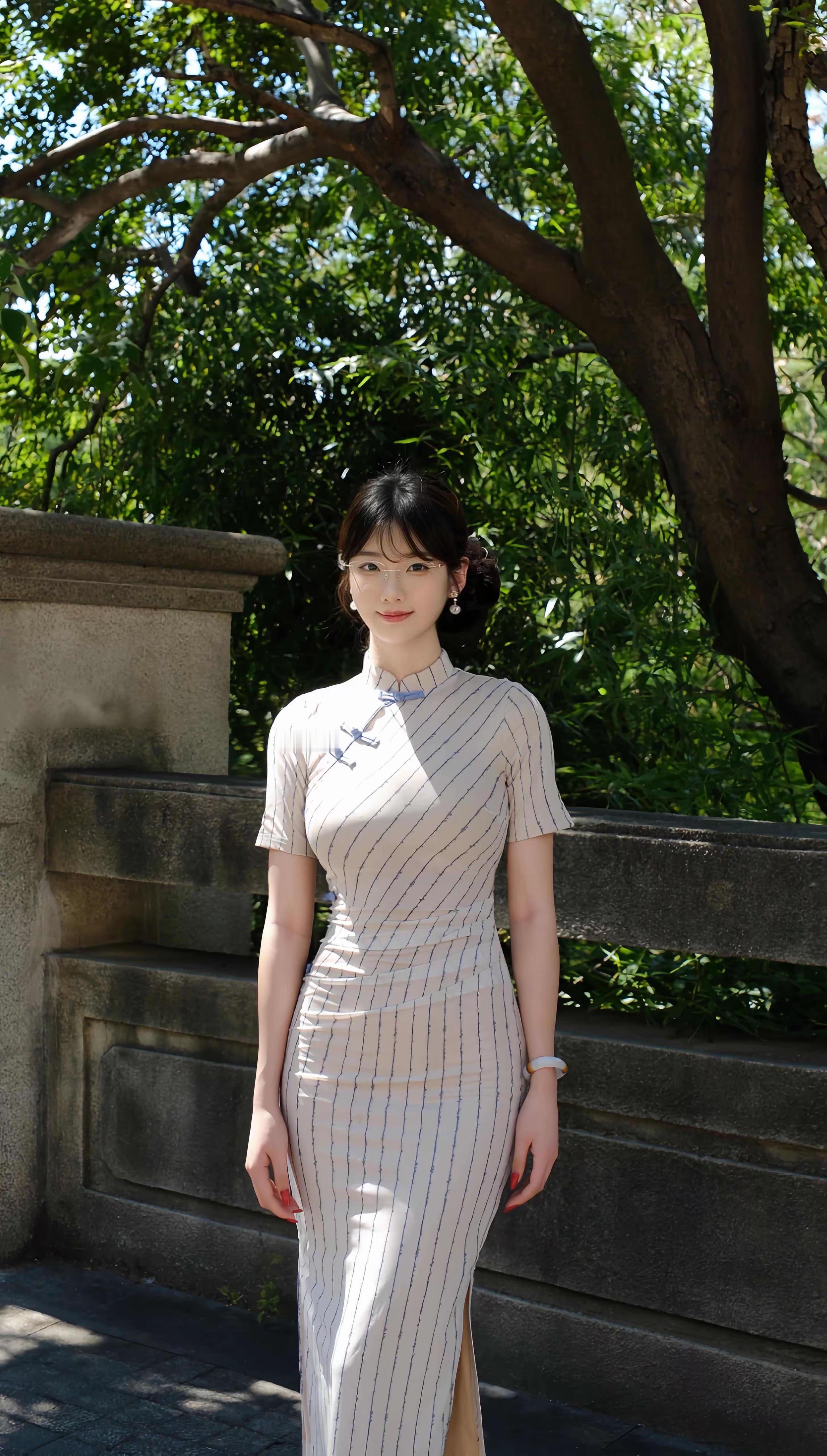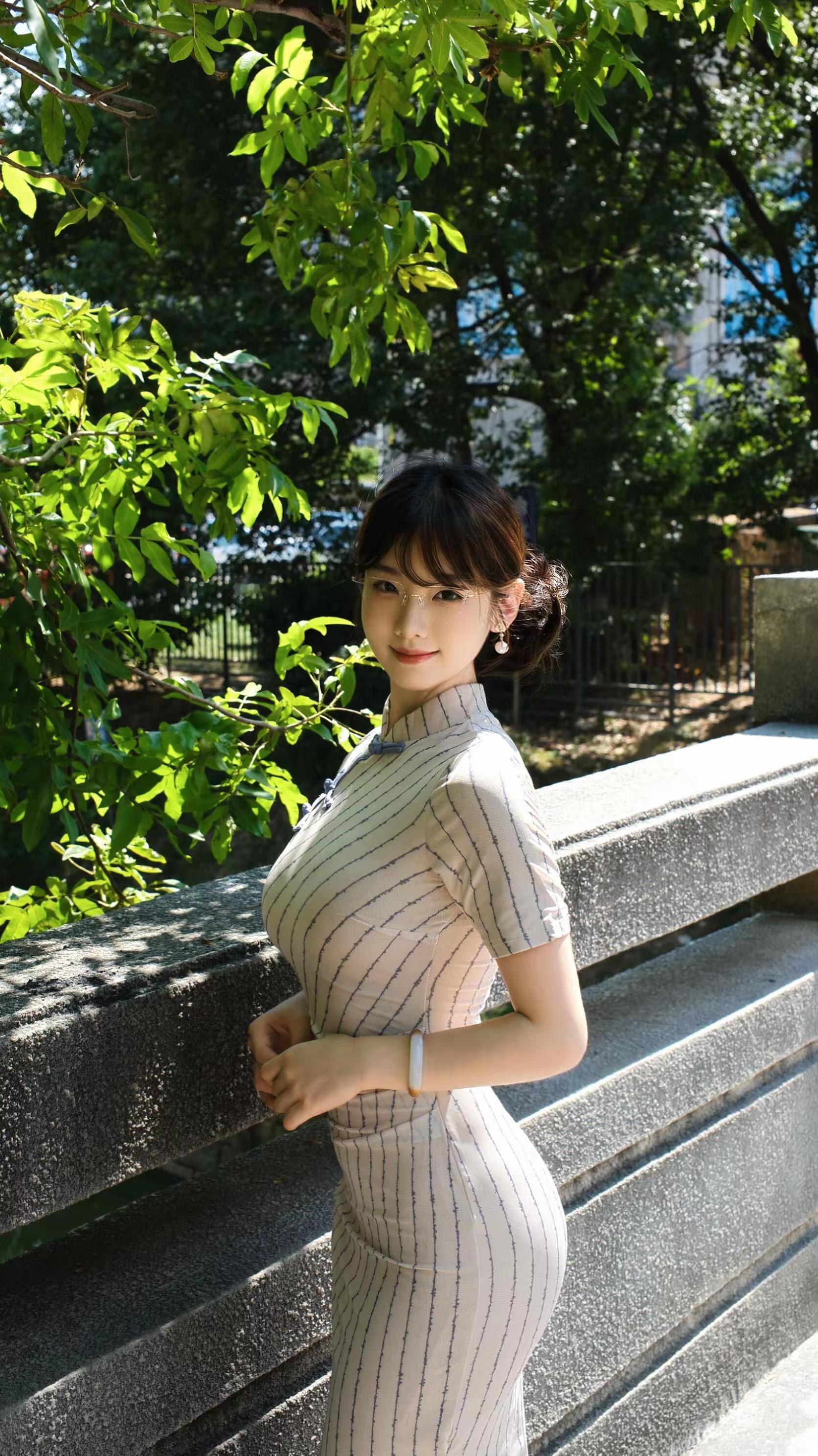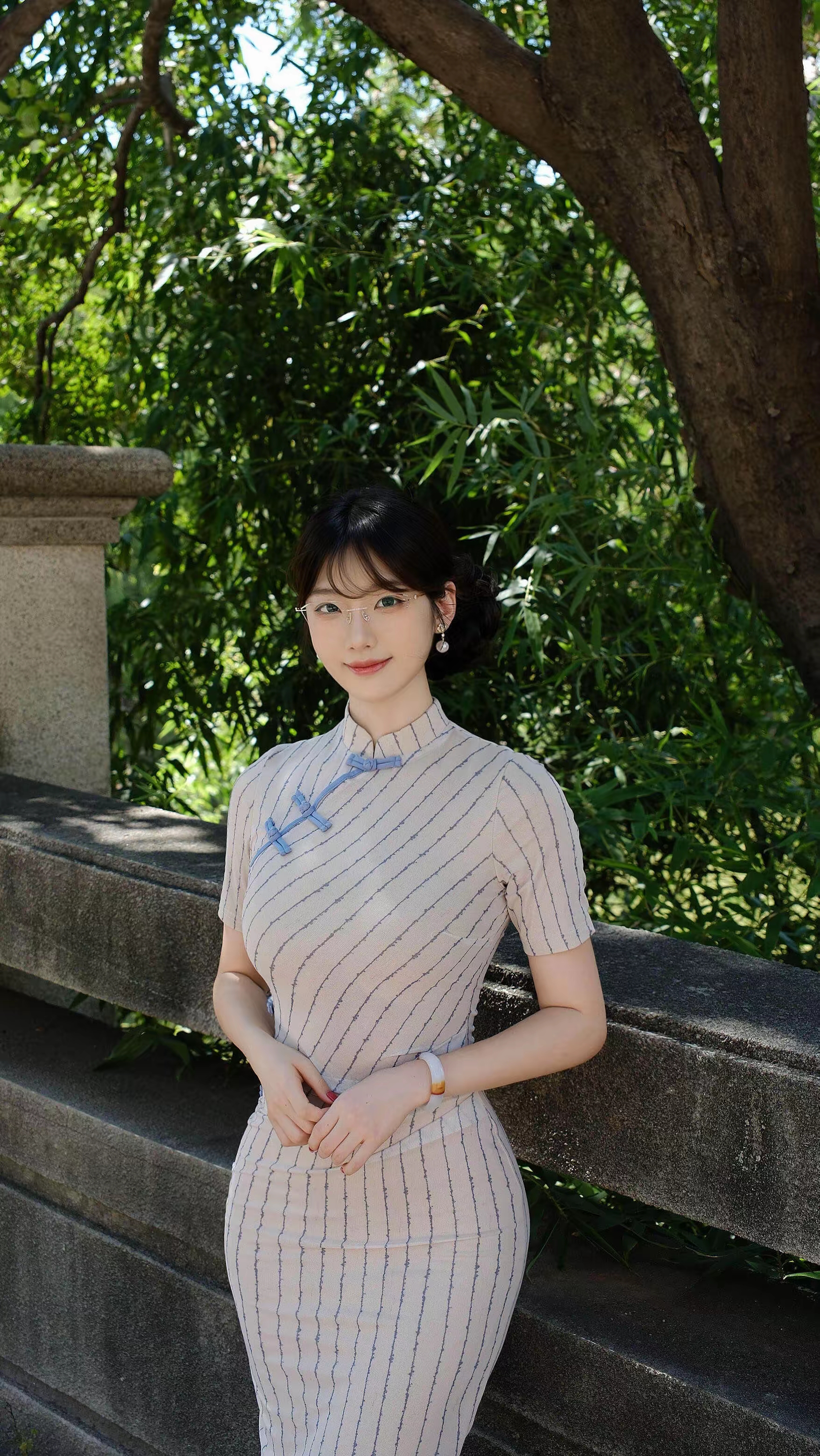 性感妖娆的女子身着条纹旗袍,于绿意盎然的户外场景中,尽显优雅古典且温婉...