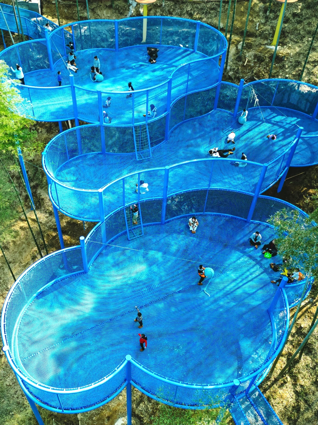 在山野之中巨大的蓝色蹦床,随心所欲的旋转跳跃腾空,甚至可以躺着感受蹦床的乐趣,尽情撒欢。