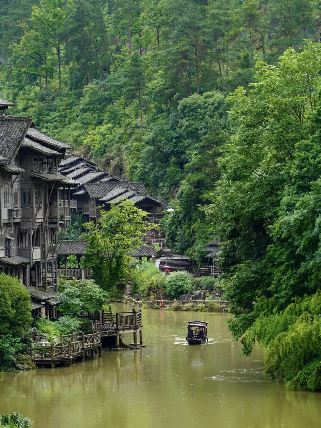 . 码头乘摇橹船,看两岸沿线铺开的吊脚楼与梯田;