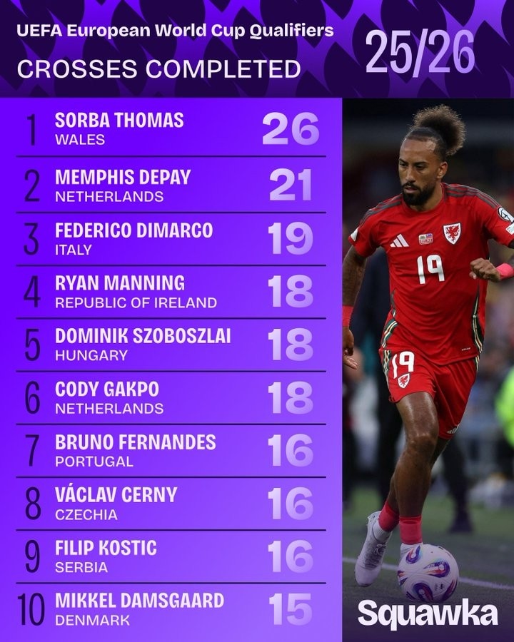直播吧11月20日讯本届世欧预小组赛已经告一段落,squakwa也统计了本届赛事成功传中情况,威尔士边锋索尔巴·托马斯领跑。
