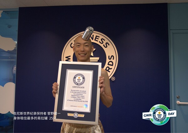 在日本东京,菅野俊一成功突破有他自己保持的"身体吸住最多的易拉罐"纪录。他在五年前首度挑战该项目,以20个易拉罐创下纪录。为纪念今年的吉尼斯世界纪录日,菅野决定再次挑战自我,成功将数量提升至25个!