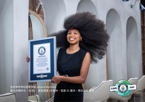 在美国,来自纽约市的杰西卡•马丁内斯(JessicaMartinez)刷新了"最大的爆炸头"纪录:发型高度29厘米、宽度31厘米,周长达惊人的190厘米。杰西卡的头发一直很长,经过多年拉直和使用化学药剂后,她在大学一年级时决定重新拥抱自然发型,并花费大量时间细心养护。当纪录获得确认后,她表示震惊并希望以此激励年轻女孩勇敢追梦。