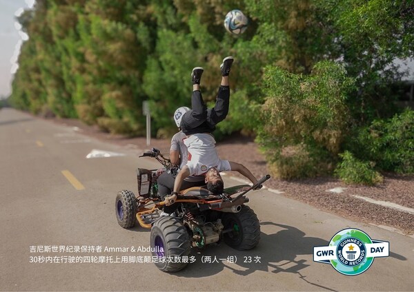 在阿联酋迪拜,花式足球表演组合阿玛尔与阿卜杜拉(Ammar&Abdulla)在以23次的成绩刷新"30秒内在行驶的四轮摩托上用脚底颠足球次数最多(两人一组)"纪录。这次挑战是极高难度的花式技术与危险动作结合,对他们掌控不稳定表面的能力是一次终极考验。在移动四轮摩托车上完成动作,不只是平衡技巧,更展示了他们的创造力、无畏态度,以及他们希望推动花式足球向动态表演进化的愿景。