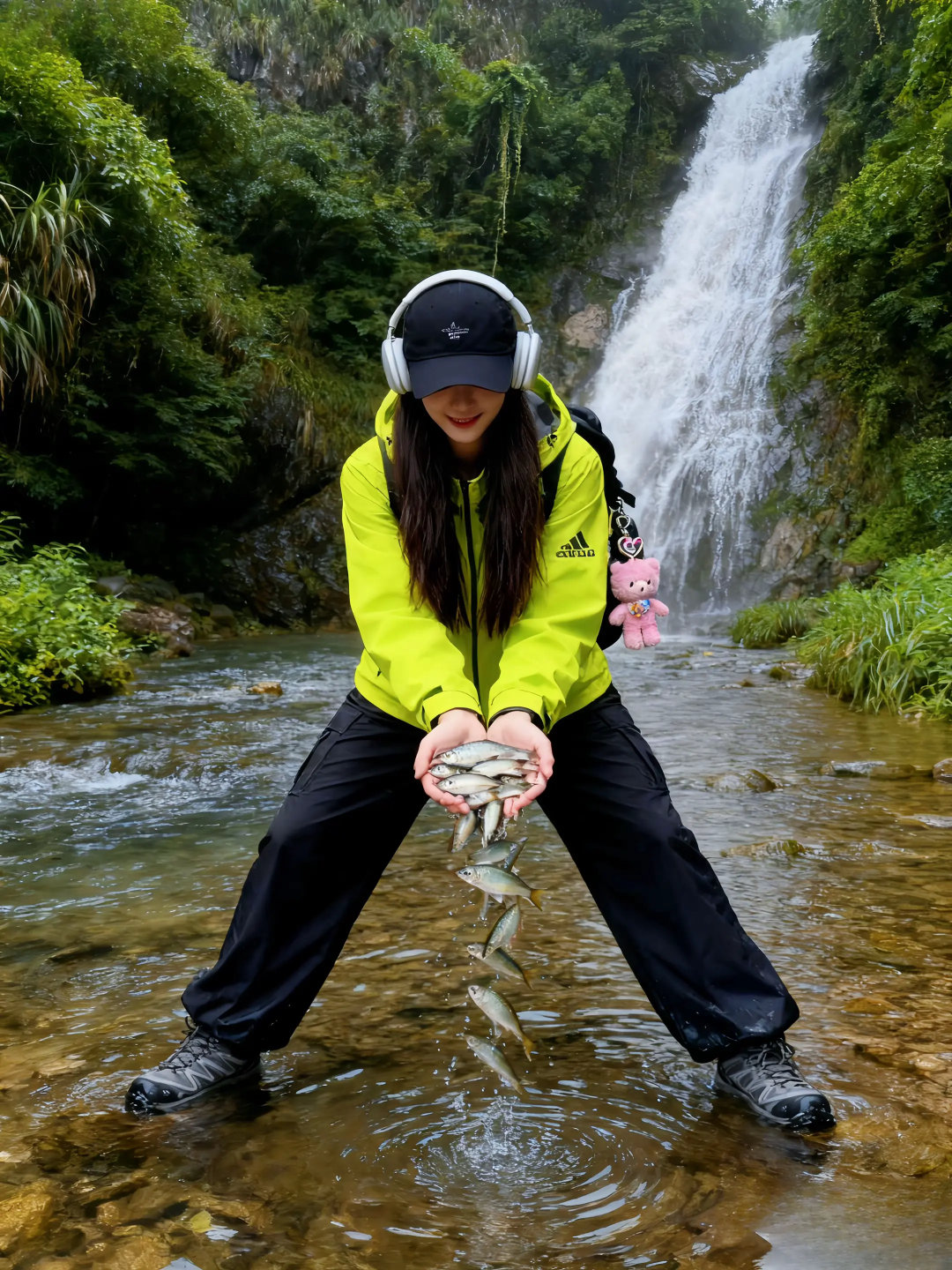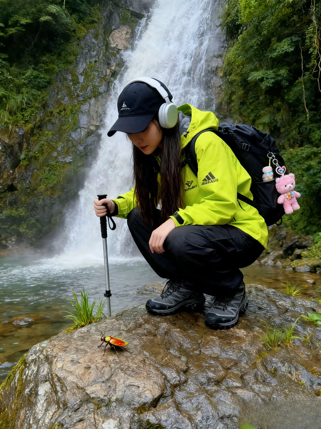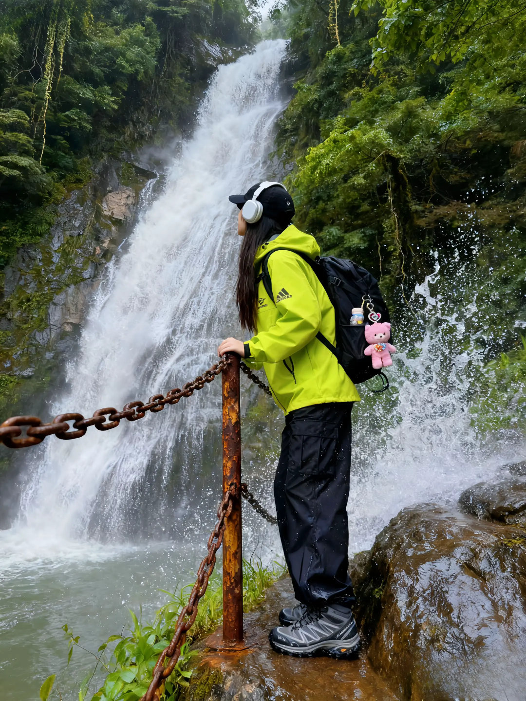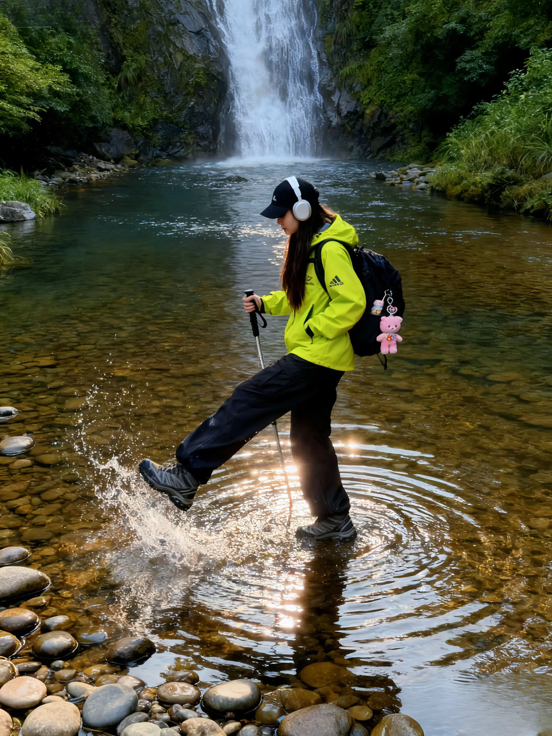 现在就出发吧!亮黄冲锋衣是活力铠甲,登山杖作伴,耳机里的歌与山风共舞。瀑水轰鸣,