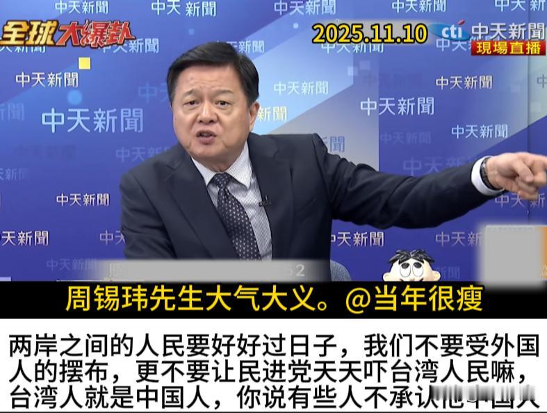 “吴石将军是为了中国人的理想而牺牲的。郑丽文祭奠他,有什么错?开口就是共谍共谍共谍,因为派系利益而攻击郑丽文。你们是不是中国人?如果不是,那么请你退出国民党,如果你是日本人,请你滚回日本。” 周锡玮先生的发言一吐我心中恶气。他的观点简单而强有力,郑丽文正在为了两岸和解而工作,在这个时候岛内各种派系,为了自己的蝇营狗苟而纷纷攻击,完全不顾及和平统一才是台湾老百姓的最大利益,不顾及身为中国人的整体立场,实在是让人恶心。 我一向喜欢周锡玮先生的观点,往往着眼大局而观察细节,他也是这一次岛内真正意义上讲出了民族大义的媒体人。这样的一锤定音,令我心生敬意。
