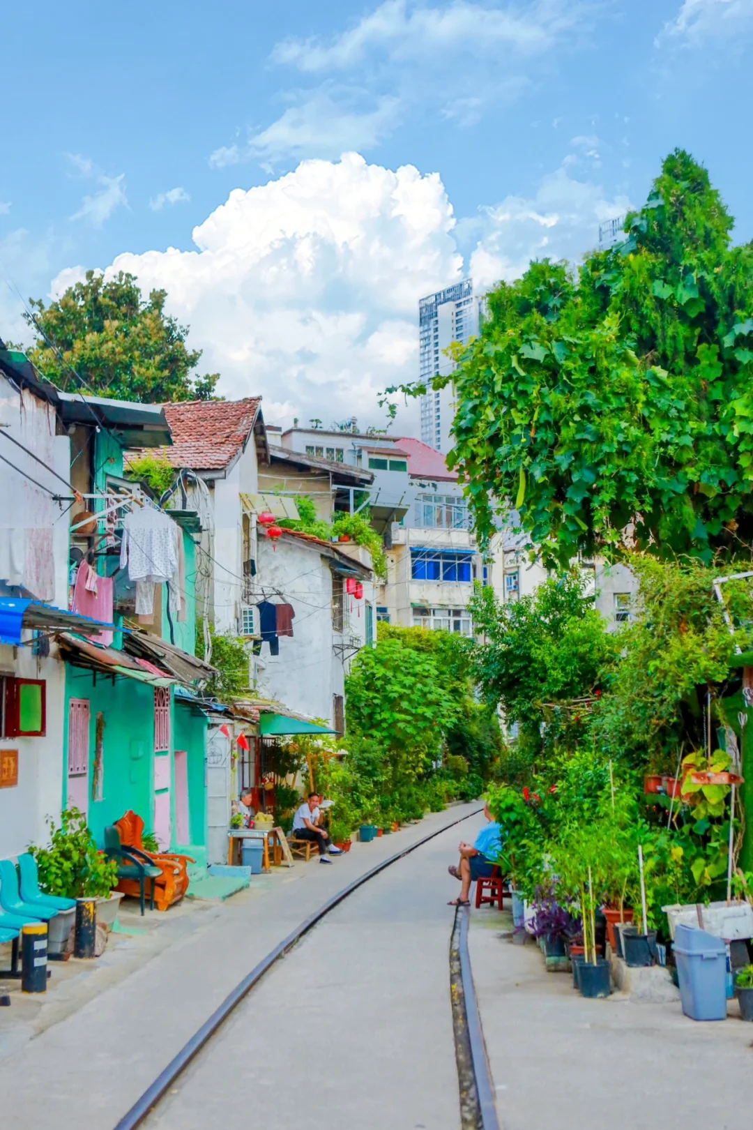 7️⃣站前花街:一条很有味道的铁轨🛤️花街铁轨从中穿过,两侧是彩色的平房,门口都被居民们种上了花花草草