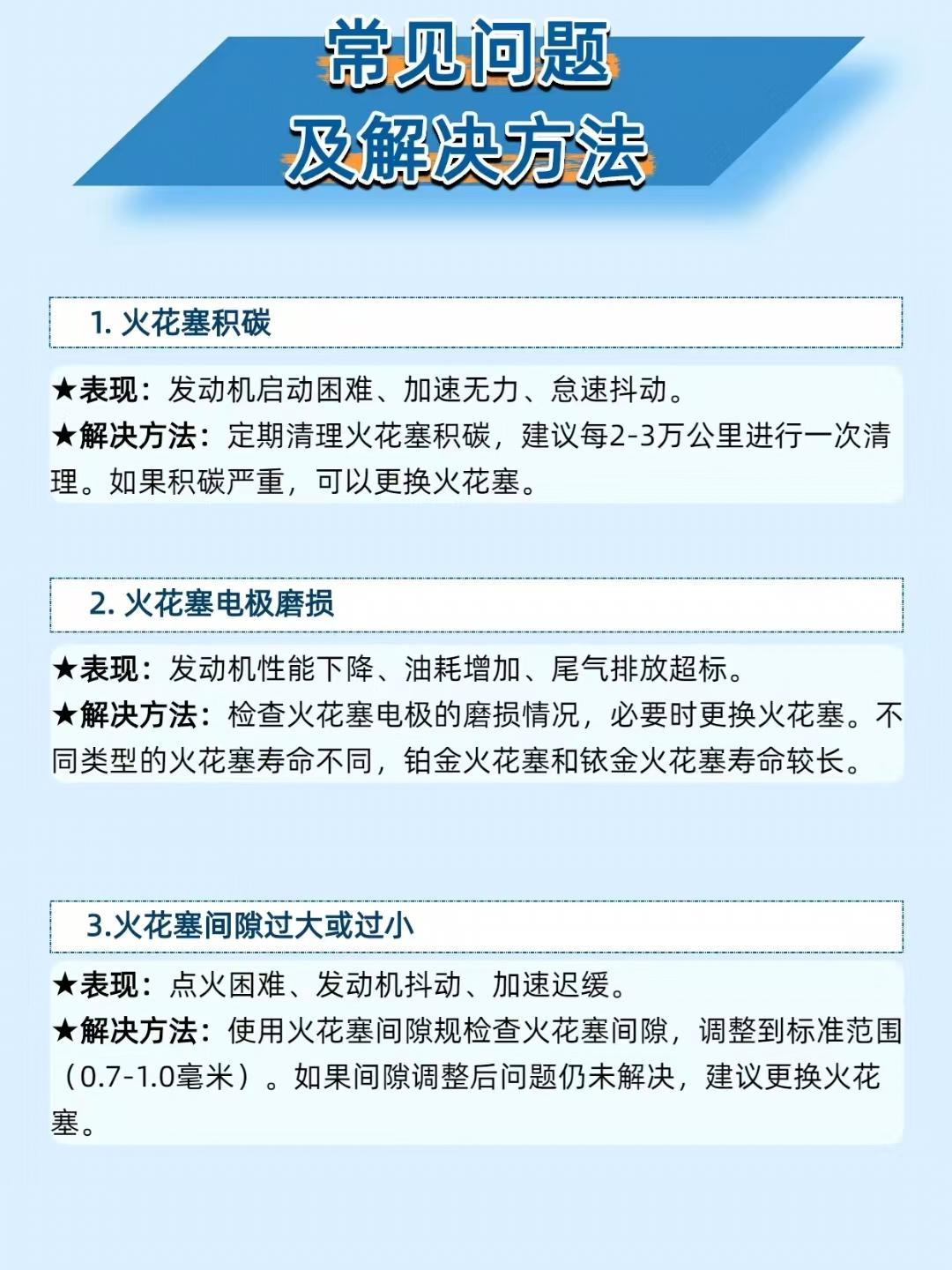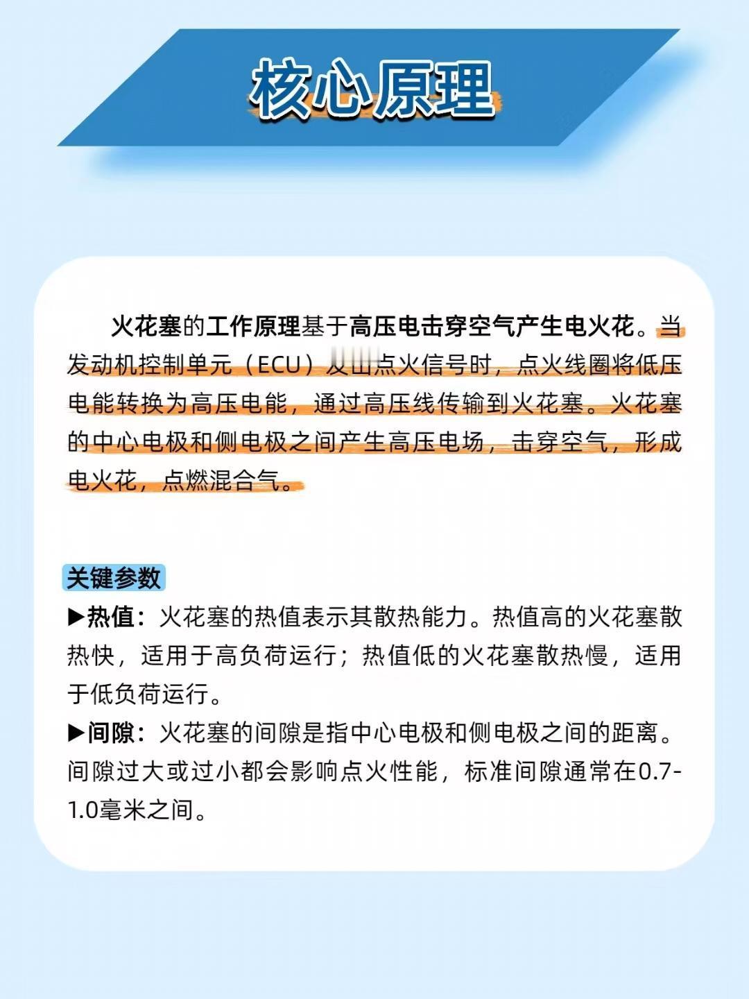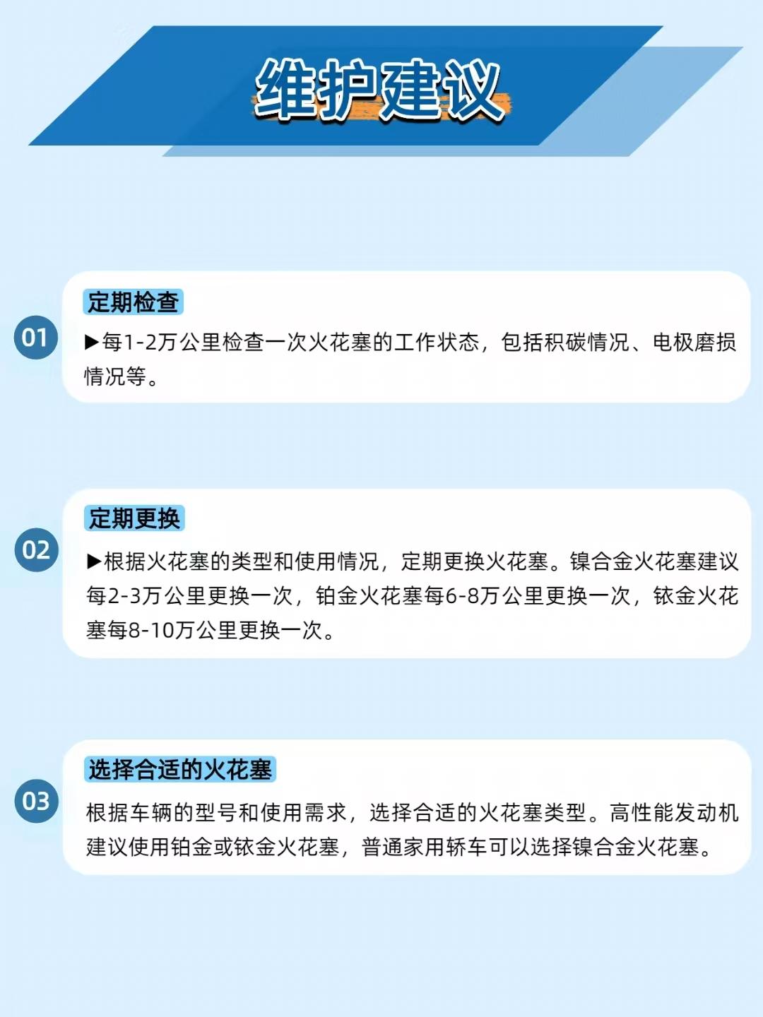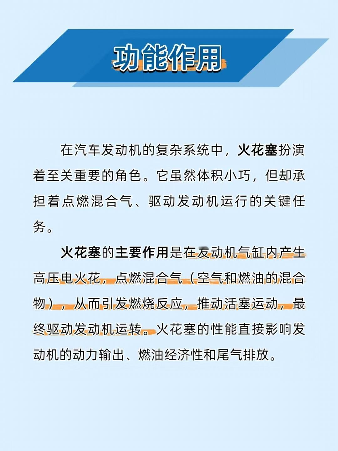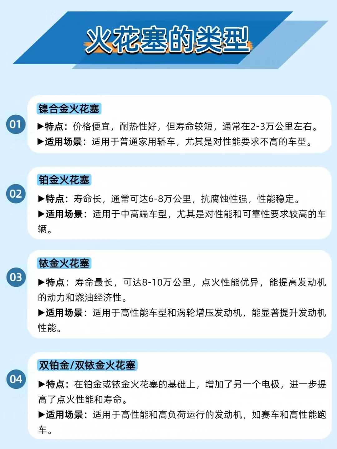 【发动机动力弱、油耗高?你的火花塞可能在 “摆烂”!】 汽车火花塞堪称发动机的 “点火指挥官”—— 靠高压电火花点燃混合气,直接决定动力输出、油耗高低和尾气排放! ——————————————————————————————————————————— 🔍 类型怎么选? 镍合金:便宜耐用,寿命 2-3 万公里,家用车够用; 铂金:寿命 6-8 万公里,抗腐蚀强,中高端车首选; 铱金:寿命 8-10 万公里,点火性能拉满,高性能车 / 涡轮增压车必备; 双铂 / 双铱金:双电极设计,性能再升级,赛车级配置。 ——————————————————————————————————————————— ⚠️ 这些症状要警惕 启动困难、加速无力→火花塞积碳,每 2-3 万公里得清理 / 更换; 油耗飙升、尾气超标→电极磨损,赶紧查型号换火花塞; 点火困难、发动机抖动→间隙不对(标准 0.7-1.0 毫米),调或换! ——————————————————————————————————————————— 📌 维护牢记这几点 每 1-2 万公里检查积碳、电极磨损; 按类型换:镍合金 2-3 万换,铂金 6-8 万换,铱金 8-10 万换; 高性能车选铂 / 铱金,家用车镍合金就够。 你的车火花塞多少公里没换了?评论区聊聊~
