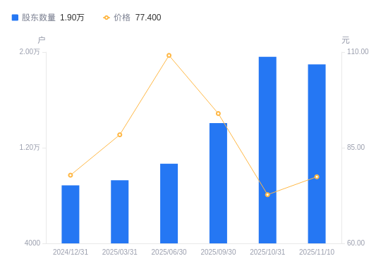 日期A股户数(户)流通A股户均持股数(股)户均持股市值(万元)2025-10-31196089151.8966.562025-09-301405312739.05119.662025-06-301065516801.68183.342025-03-31928619278.69170.392024-12-31884620237.61157.492024-09-30870720560.69124.662024-06-3092354331.8422.912024-03-31104893813.9515.622023-12-31171062195.738.542023-09-30212991763.477.46