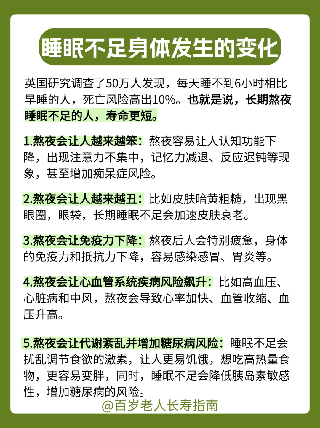 熬夜对身体的伤害是非常大的,熬夜会让你大脑变笨,越来越丑,免疫力下降,气色变差……甚至调查发现,相比早睡的人,长期睡眠不足6小时,平均寿命也可能受到影响。