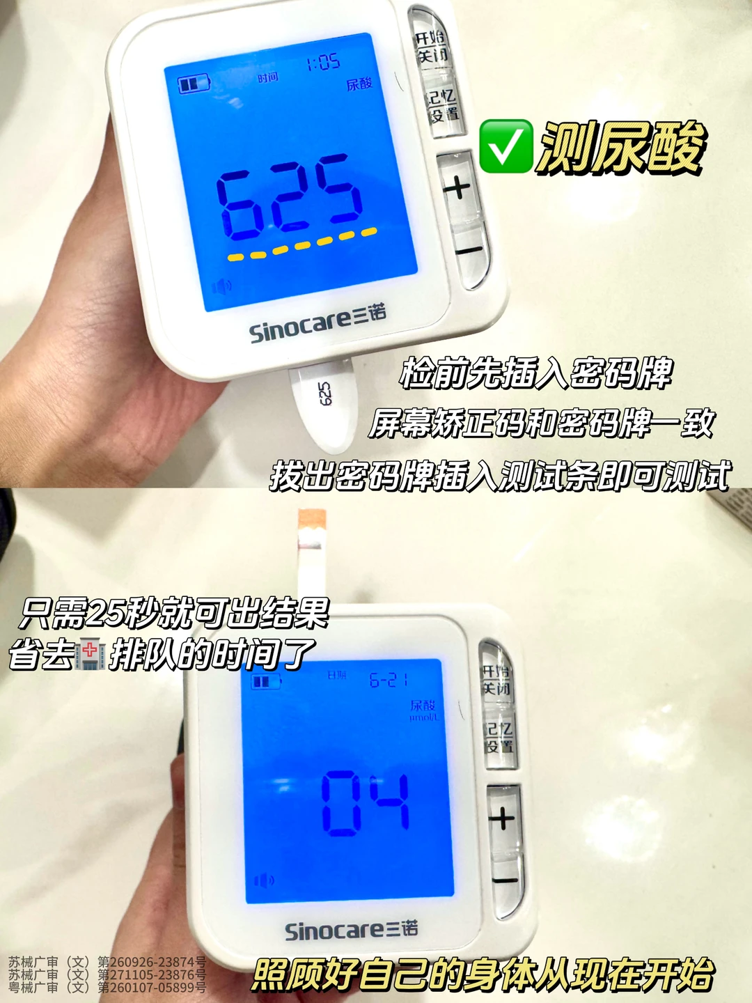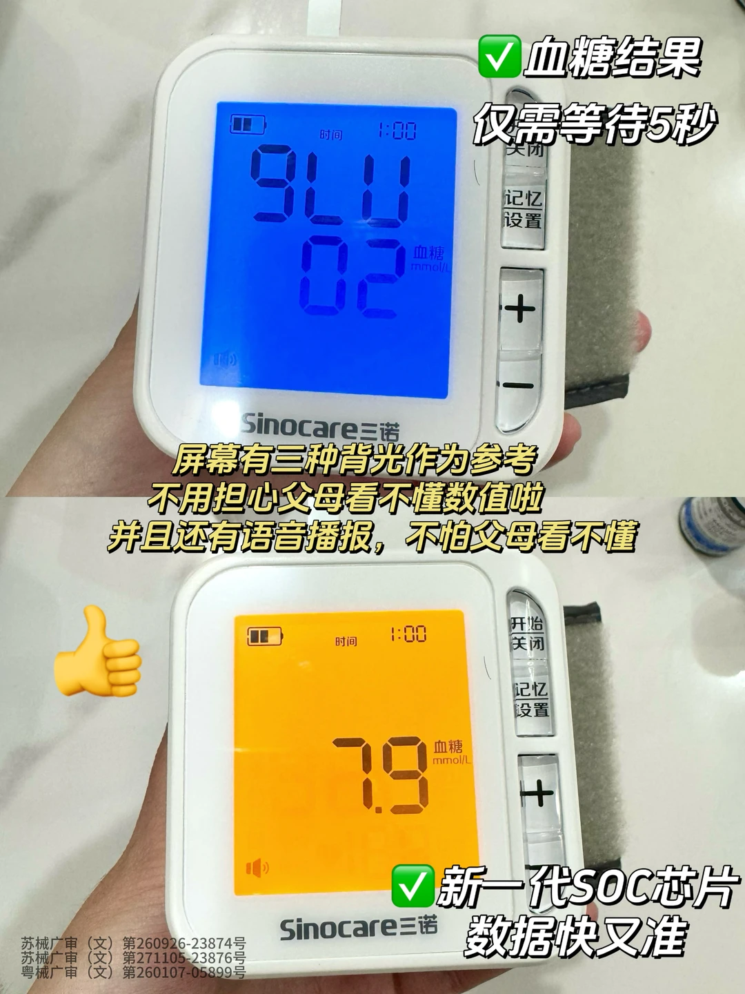 [星R]尤其是很多老年人因为不注意饮食,喜欢吃腌制品,血糖和血压就要尤为注意,三诺三测机天天都能检测,5秒钟就能看到血糖结果,25秒钟就能看到尿酸结果。而且屏幕上有不同颜色的背光作为参考,哪怕是老人也能看懂数值高低,还有贴心的语音指导操作和读数功能,不用戴老花镜,听就能知道结果。