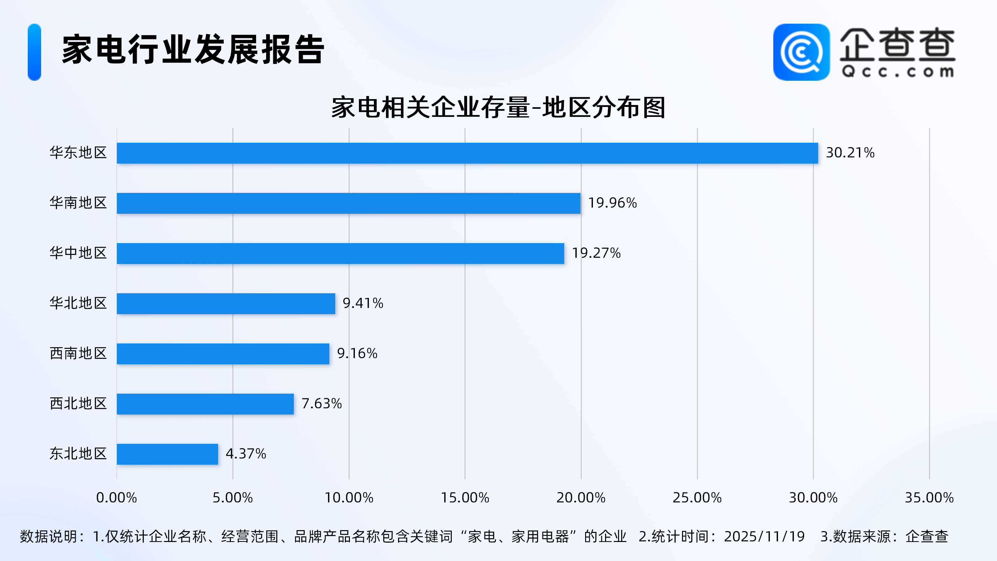 企查查数据显示,从地区分布来看,家电相关企业主要分布在华东地区,占比30.21%。其次,分布在华南地区、华中地区的家电相关企业分别占比19.96%、19.27%。