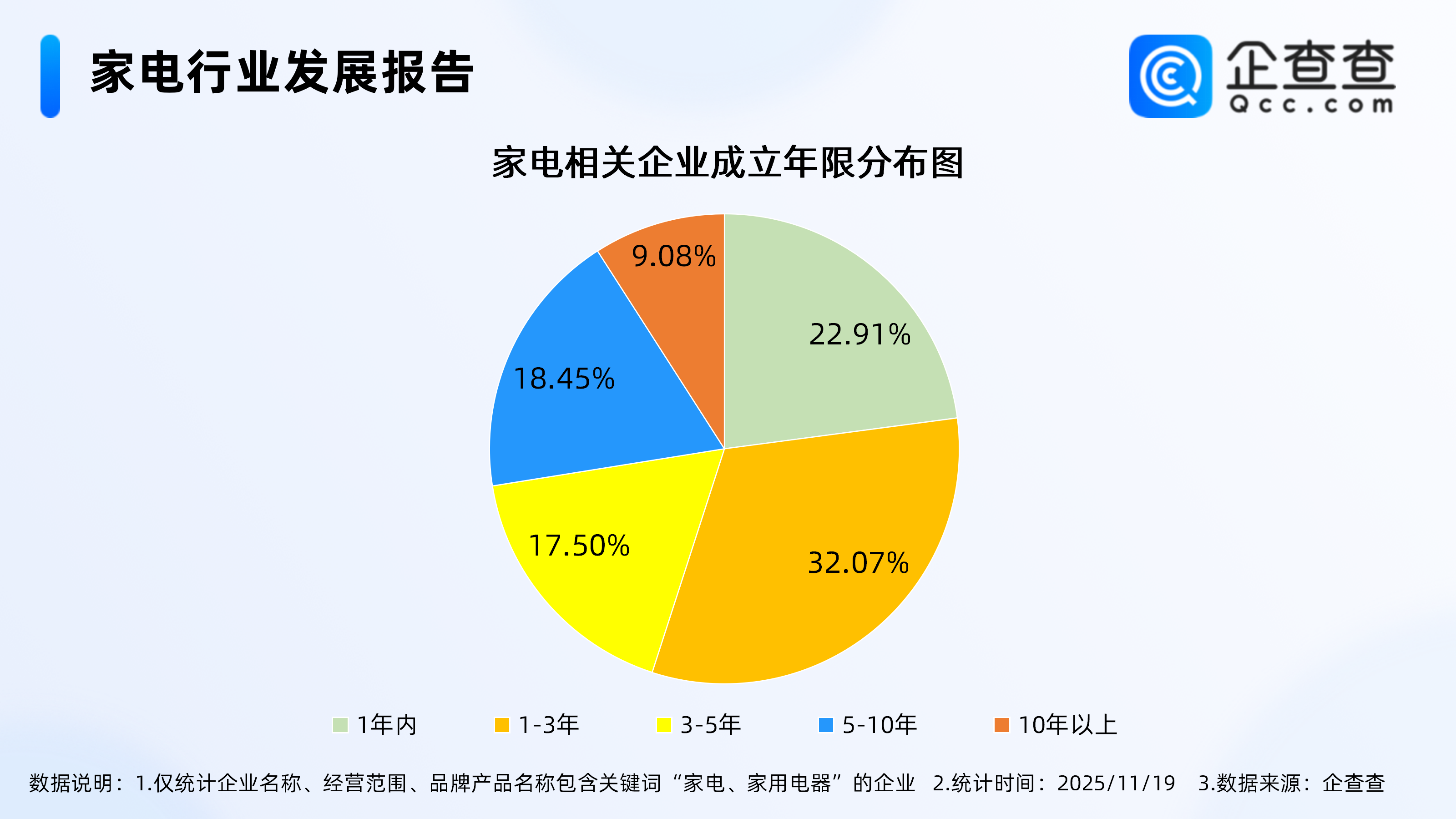 企查查数据显示,从经营时间来看,家电相关企业多成立于近三年,成立年限在1-3年的相关企业最多,占比达32.07%。其次,成立年限在1年内、5-10年的相关企业分别占比22.91%、18.45%。