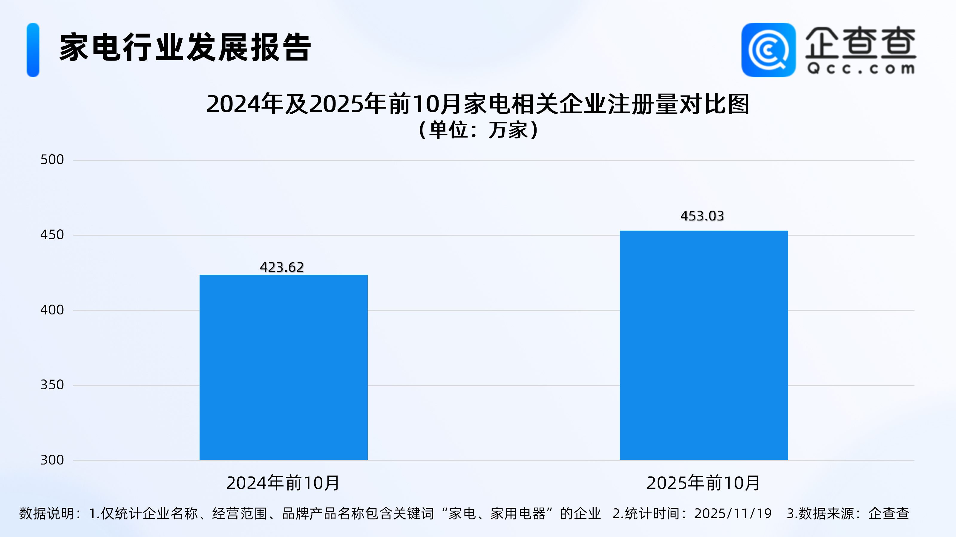 企查查数据显示,截至11月19日,国内现存家电相关企业2223.48万家。近十年相关企业注册量呈整体增长态势,其中2023年全年注册量首次突破500万家,同比增长49.80%至550.63万家。2024年注册量有所下滑,但仍处于高位,全年注册521.6万家。截至目前,今年已注册480.22万家,其中前10月注册453.03万家,同比增长6.94%。