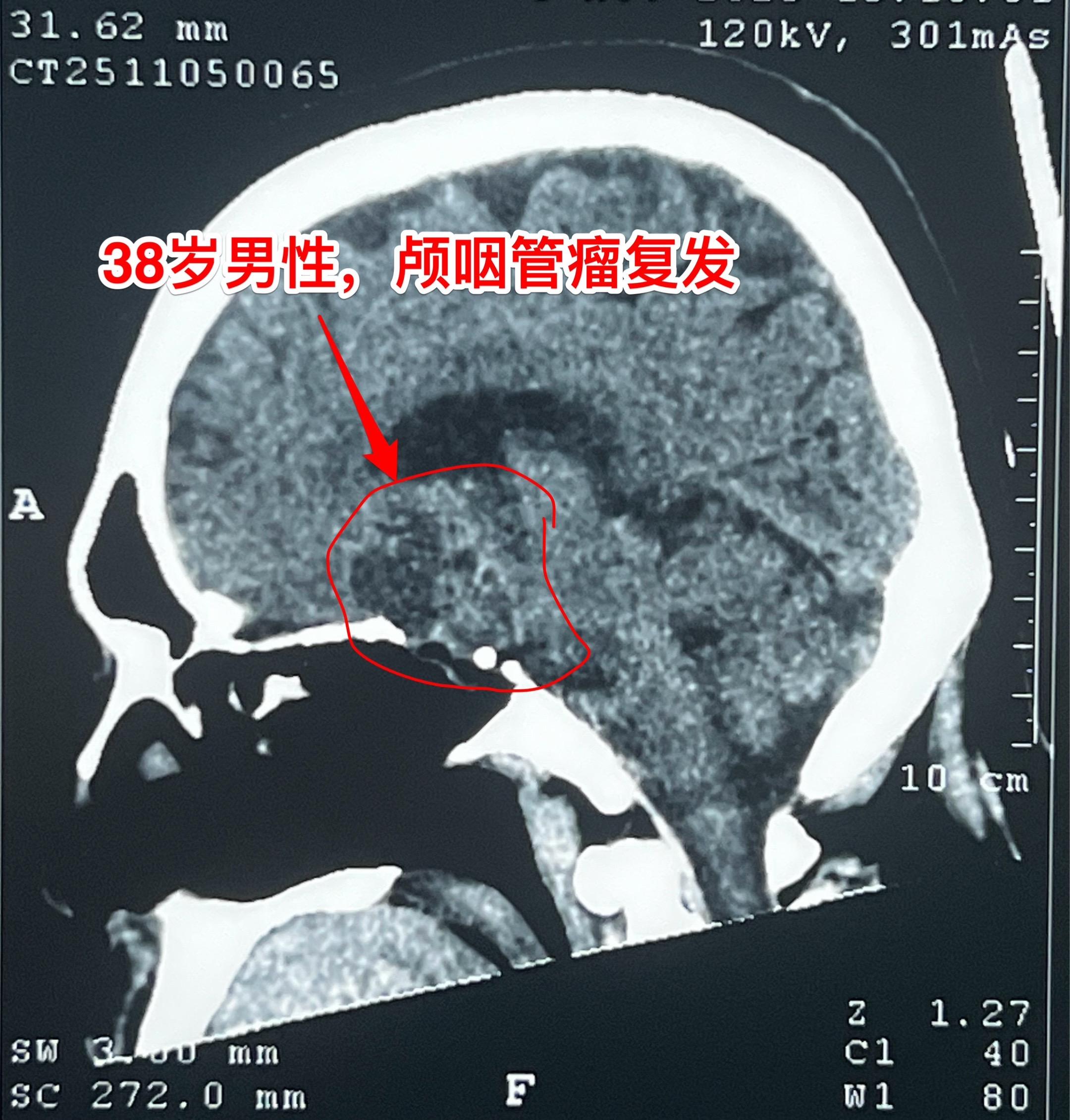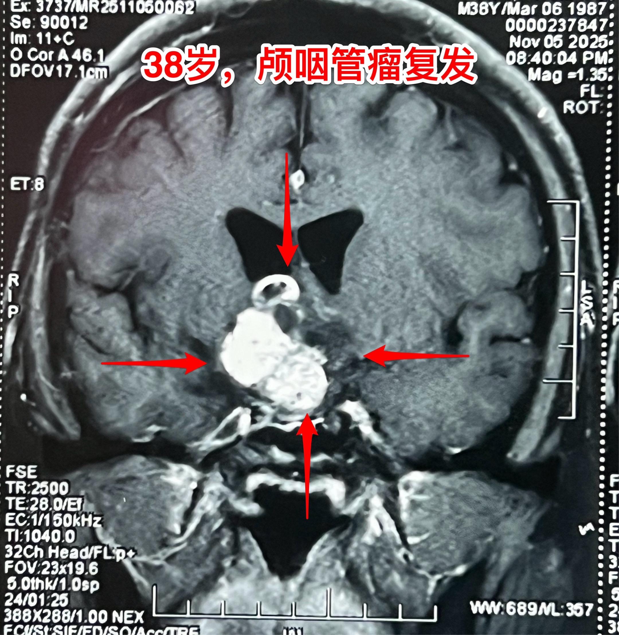 多次治疗后又复发的颅咽管瘤-不要轻易放弃。38岁福建男性,颅咽管瘤复发。 十年前因颅咽管瘤导致右眼几乎失明、右侧肢体无力,在上海行开颅手术切除颅咽管瘤,术后右眼完全失明。随后放疗一个月。2023年因颅咽管瘤复发在福建省某医院行经鼻内镜手术切除复发颅咽管瘤,肿瘤有残留。2025年5月仅有视力的左眼出现又视力下降,磁共振显示颅咽管瘤复发了,体积在增大。 病人患病十年,仍是未婚状态,家人的照顾是非常周到的。两个姐姐、两个妹妹和父母都在极力照顾他,这次得知肿瘤复发了,找到我,还是希