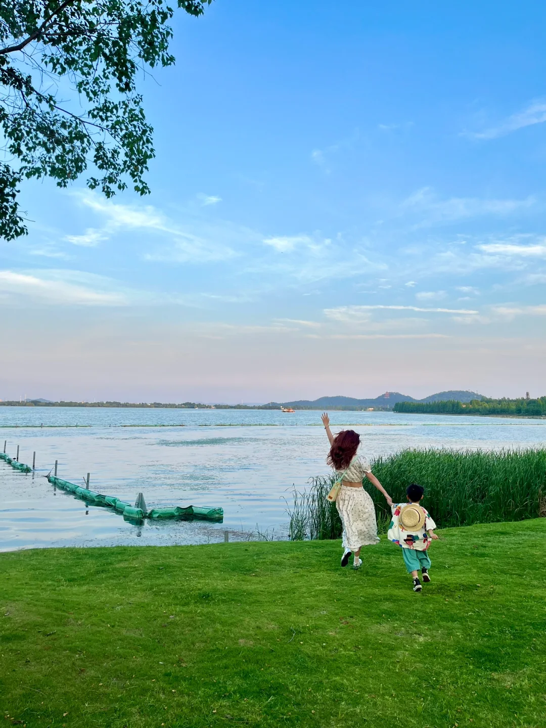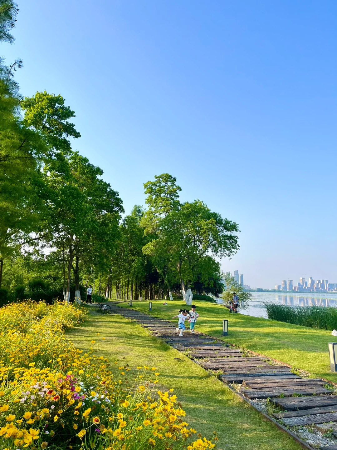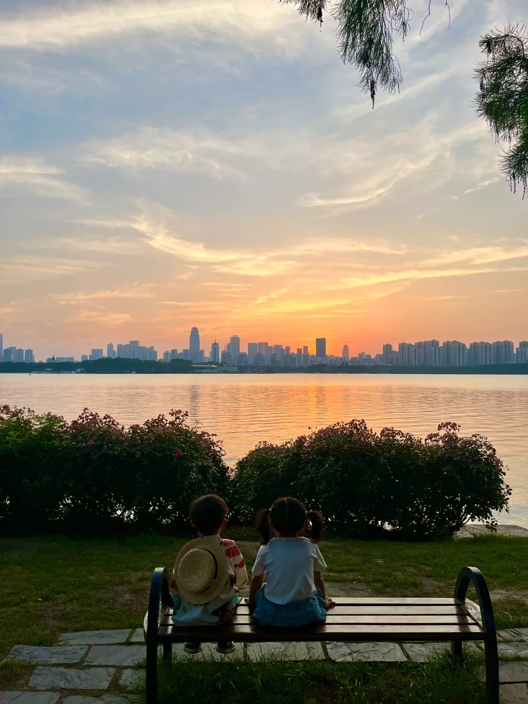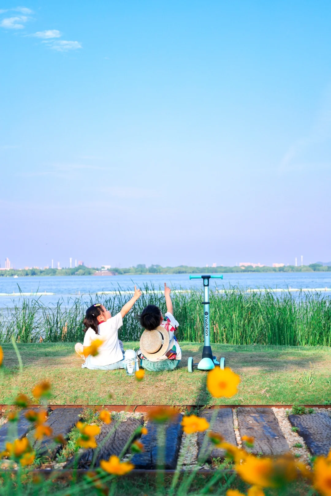 去年走过武汉好玩地100站‼️今年继续 第231站:武汉东湖发呆亭🌼 东湖是去N次都不会腻的地方🌊 但周末总是人很多 找到了一条沿湖小道‼️完全没人‼️ 小朋友们可以尽情奔跑玩耍 现在沿湖长满了小黄花🌼 还有大颗的桑葚树‼️已经结果成熟了 湖边还有大片的草坪,可以在树荫下野餐🧺 偶尔还会看到热气球升起❤️ 确实是适合发呆放空的好地方💤 - 🧺游玩攻略: ✔️开车导航:楚风园停车场🅿️,地铁🚇出行梨园站下⬇️,然后骑行或者乘观光车到达“发呆亭” ✔️不能带滑板车🛴‼️我们是可以组合成遛娃神器才可以进到东湖绿道的 ✔️这个季节武汉还不算热,我们带上野餐布、野餐食物玩到看完日落🌄才回家 ✔️记得带上水杯,及时补充水分💦 -