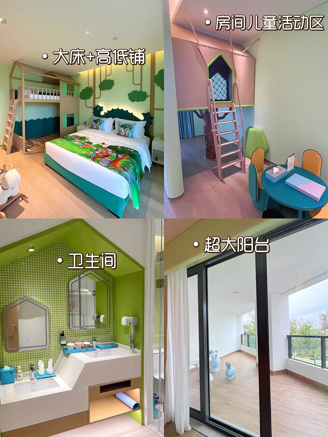 🏠住:有三种不同主题的客房,洞穴探险、蜂之部落、丛林秘境,我们选的是丛林秘境,因为小肥羊喜欢恐龙,有高低铺,一张大床,还有一个大阳台,可以看到奇趣童年里面,每层楼都有不同主题的公共儿童活动区,小朋友可以聚在一起玩耍🥳