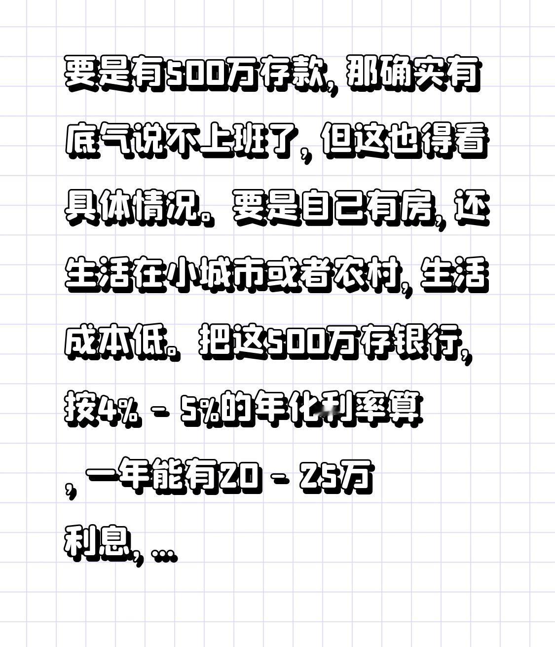 要是有500万存款,那确实有底气说不上班了,但这也得看具体情况。 要是自己有房,还生活在小城市或者农村,生活成本低。把这500万存银行,按4% - 5%的年化利率算,一年能有20 - 25万利息,应付日常开销那是绰绰有余。 不过呢,通货膨胀会让钱越来越不值钱,光靠吃利息可不行,还得搞点保守投资,比如买点国债或者稳健型基金。 要是没房,在大城市买套房可能就把这500万都花光了。 而且还得考虑健康保险和意外支出这些事儿。要是有份工作轻松还挣钱多的工作,那肯定还是会接着干。