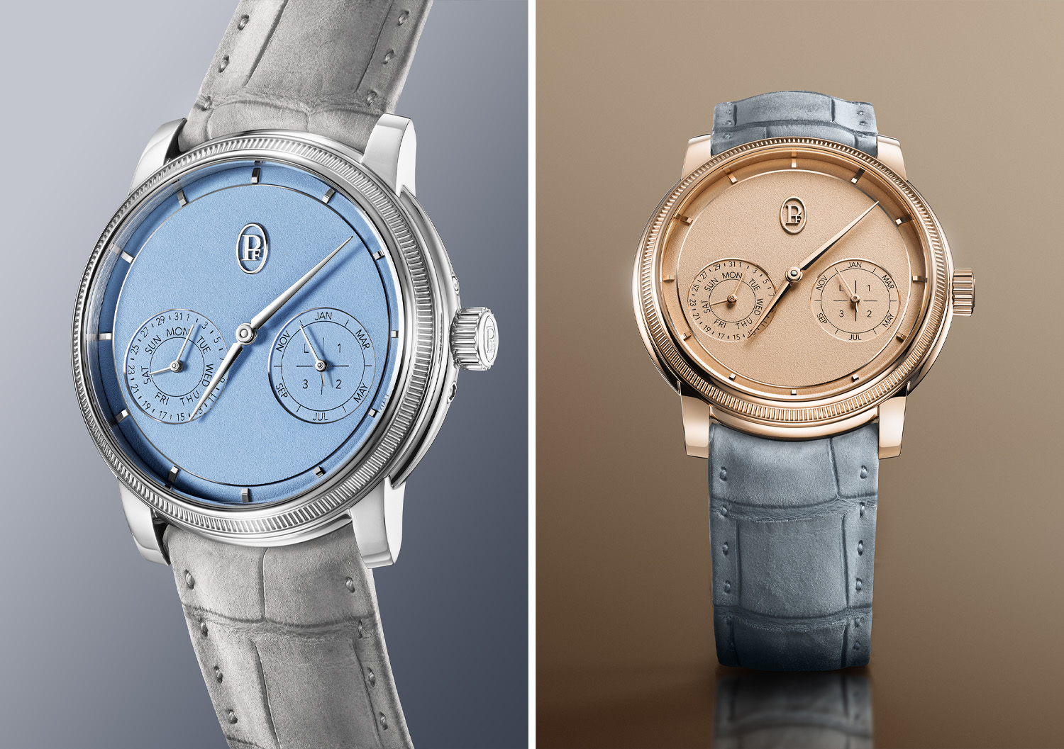 自去年焕新回归的Toric寰宇系列,今年迎来两位全新成员:Toric寰宇系列万年历腕表,每款限量50枚。两款新作均搭载品牌自制18K玫瑰金机芯,透过表背可欣赏机芯独特美感,大型18K玫瑰金桥板经手工装饰以品牌独有的弗勒里耶波纹饰面,与喷砂处理的主夹板形成视觉对比。材质与配色上,铂金表壳搭配充满活力的极致亮蓝,而18K玫瑰金表壳则搭配“黄金时刻”色调表盘,两款表盘均采用手工粒面处理工艺打造出微妙的颗粒质,尽显细腻的纯粹之美。