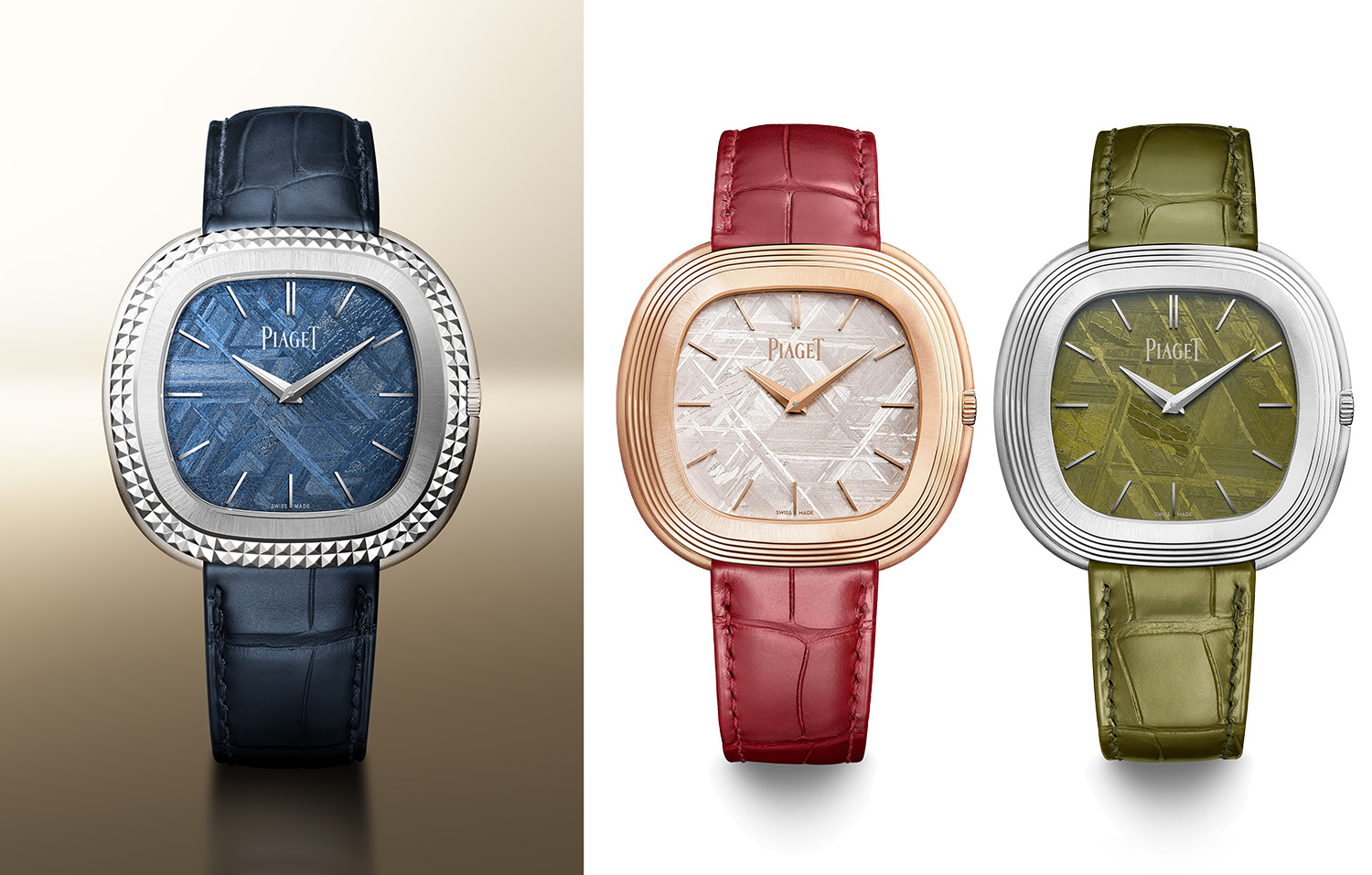 右:伯爵安迪·沃霍尔腕表,白色陨石表盘18K玫瑰金表壳、深绿色陨石表盘搭配18K白金表壳