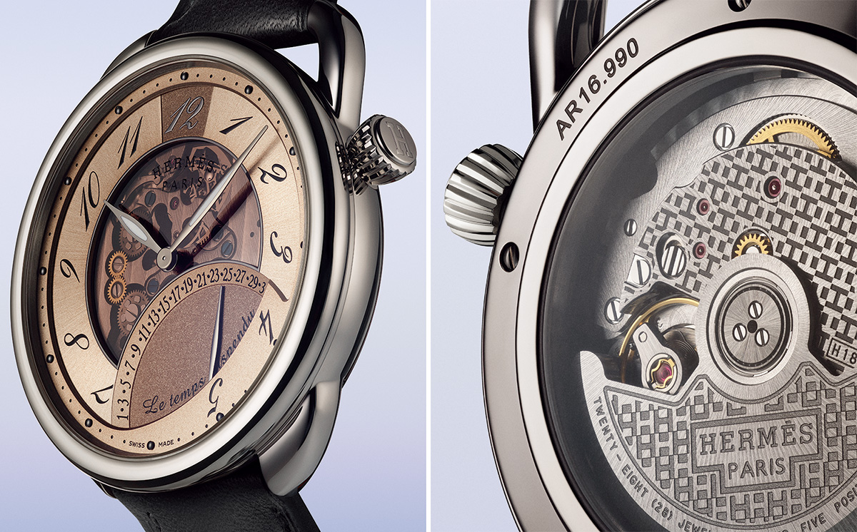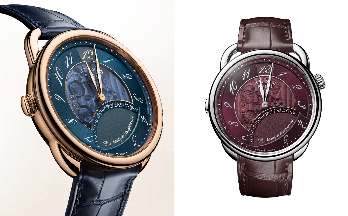 爱马仕重新演绎2011年的时间暂停腕表初版设计,为其赋予全新的美学内涵。在42毫米的纤薄表壳中,由镂空表盘隐约展露独一无二的“Letempssuspendu”时间暂停功能模块;同时透过表背清晰可见驱动该功能模块的品牌H1837自制机芯。全新表款采用白金或玫瑰金表壳,呈献三种表盘色彩——旭日蓝色、旭日brundésert、旭日rougesellier,均搭配由爱马仕钟表工坊制作的标志性不对称马镫型表耳。
