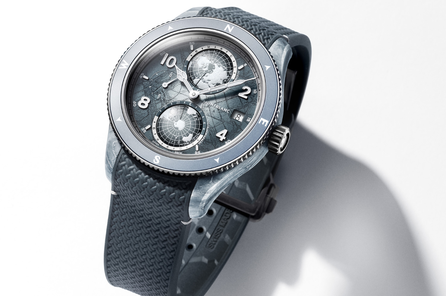 腕表采用43.5毫米钛金属表壳,并搭载由创新复合材料打造的全新中壳,其设计灵感源自文森峰的地貌。该新型复合材料开创性地将石英纤维、铝基玄武岩纤维、碳酸钙和浅蓝色树脂相结合,营造出独特的美学设计,让人联想到南极洲古老冰川的色彩与纹理。此外,该新作以蓝绿和浅灰晕染色调演绎“冰川纹”表盘。