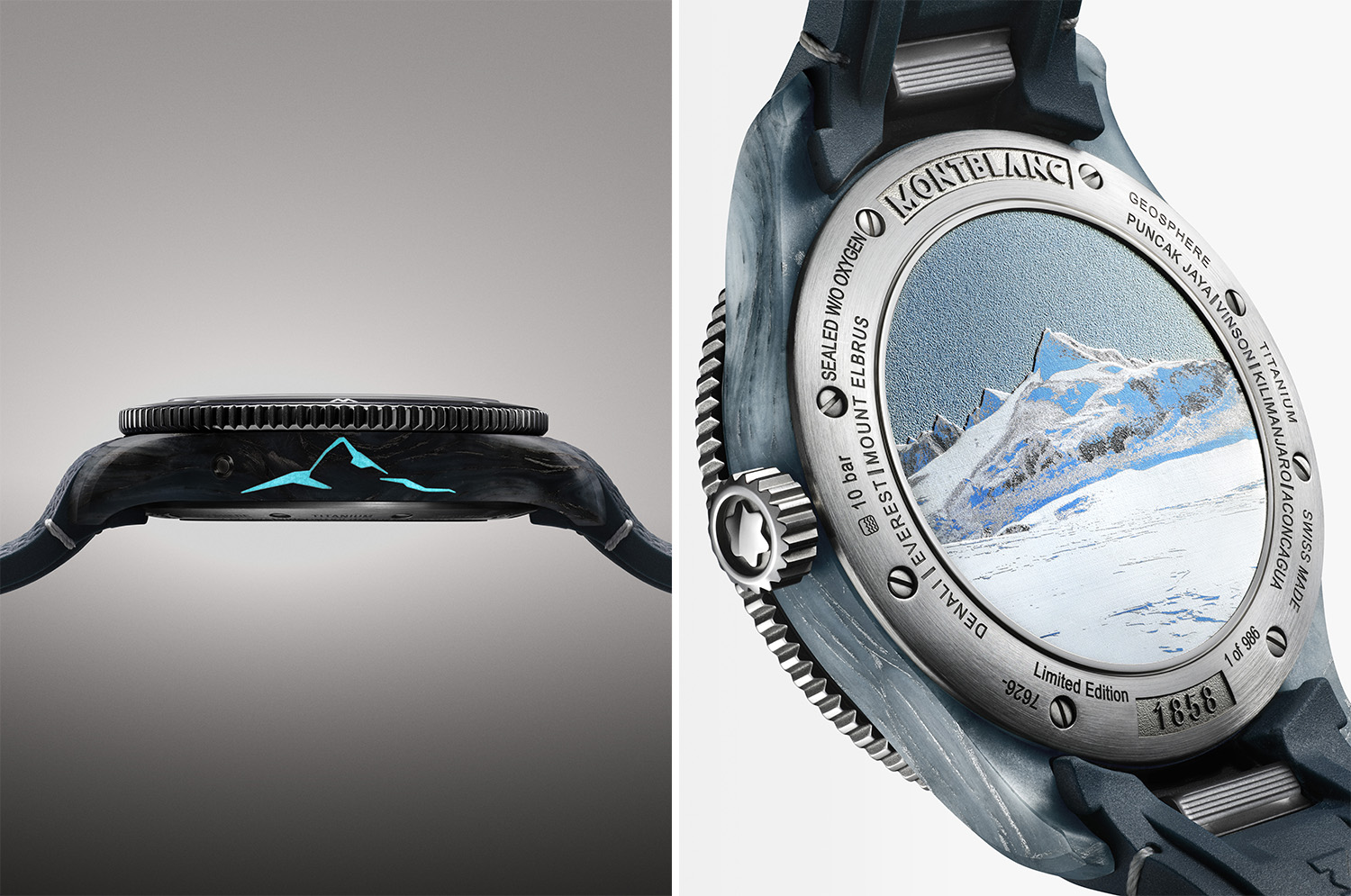 1858系列南北半球世界时无氧腕表此次推出全新南极文森峰特别款,全球限量986枚。南极洲文森峰是传奇登山探险家、万宝龙品牌大使莱因霍尔德·梅斯纳尔“七大高峰攀登挑战”的最后一站。为了致敬这位传奇登山探险家及其创造的壮举,代表“梅斯纳尔世界七峰名录”中的“七大高峰”以及勃朗峰,以圆点的方式标识于表盘标志性的南、北半球上,而表背亦镌刻巍峨壮观的文森峰图案。