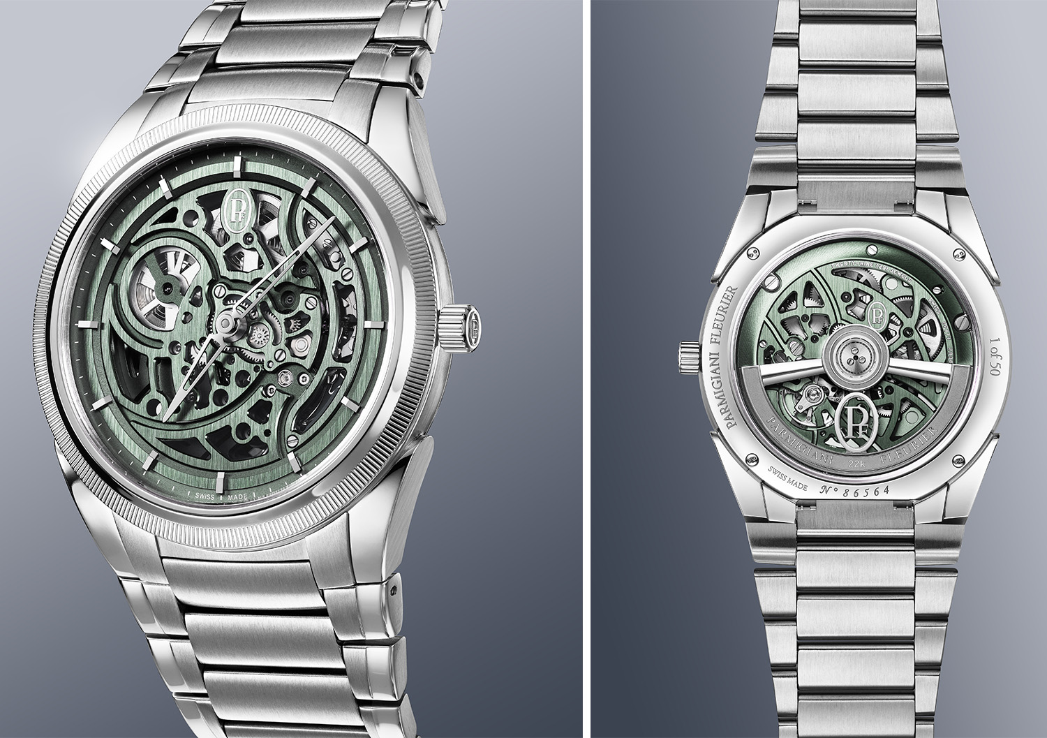 同样是绿色调,TondaPF镂空腕表则呈现了另一种风格。镂空表盘采用灵感源自勒·柯布西耶(LeCorbusier)建筑色彩的绿岩灰色,与PF777机芯犹如当代建筑杰作般的复杂机械结构相得益彰。该新作限量50枚。
