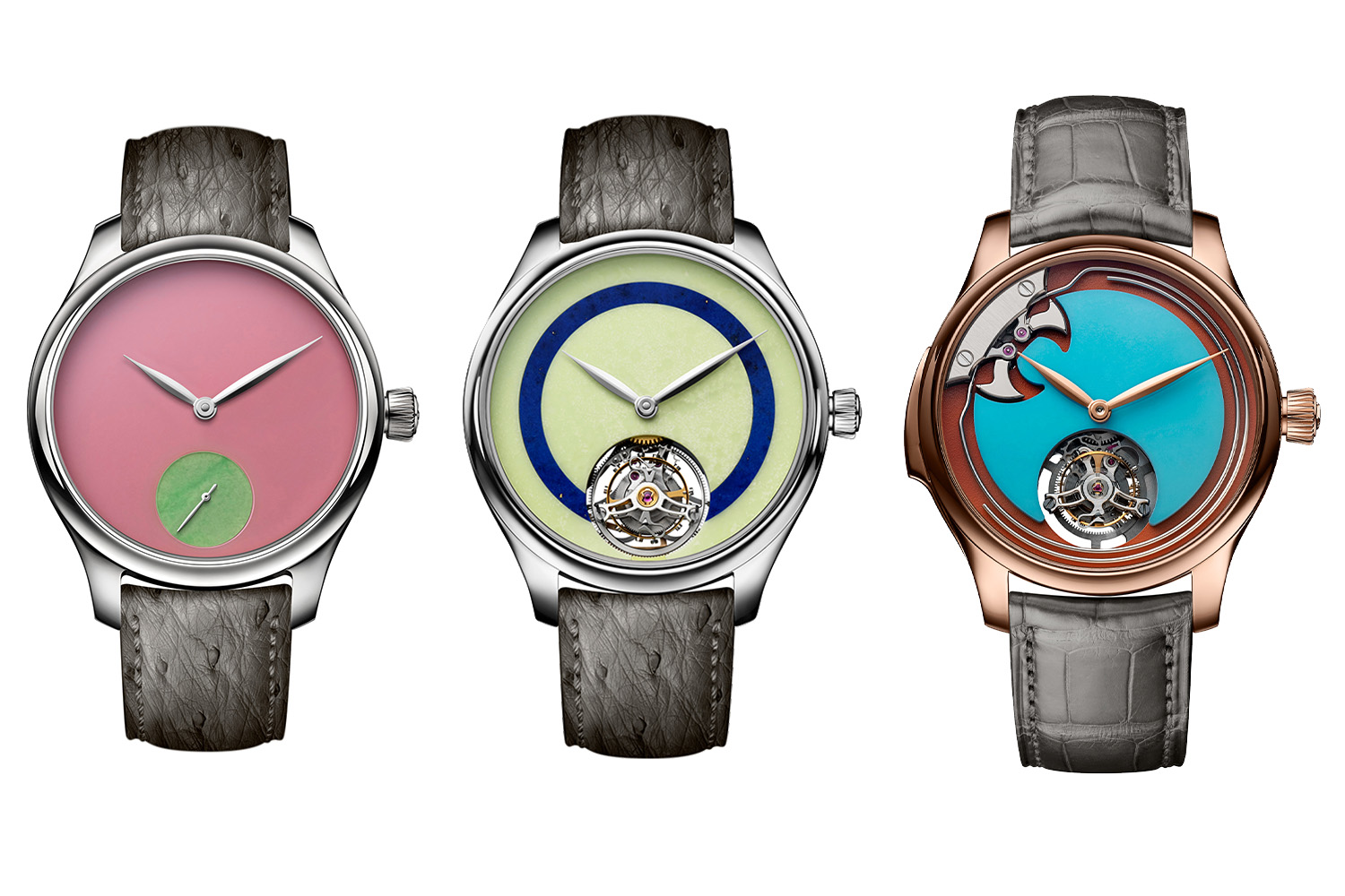 缅甸玉与粉色欧泊、青金石与柠檬绿玉髓、绿松石与深橙珊瑚,每颗原石都经过极其严苛的甄选,既色泽浓郁,又净度非凡。而天然宝石的独有纹理造就这一限量系列的独特生命力,每一款腕表都是独一无二的典藏臻品。针对不同配色,勇创者系列小秒针概念腕表每款配色限量发行28枚,勇创者系列陀飞轮概念腕表限量发行5枚,均为38毫米精钢表壳,搭配灰色鸵鸟皮表带;而勇创者系列陀飞轮概念版三问腕表仅有一枚,为38毫米5N红金表壳,搭配灰色鳄鱼皮表带。