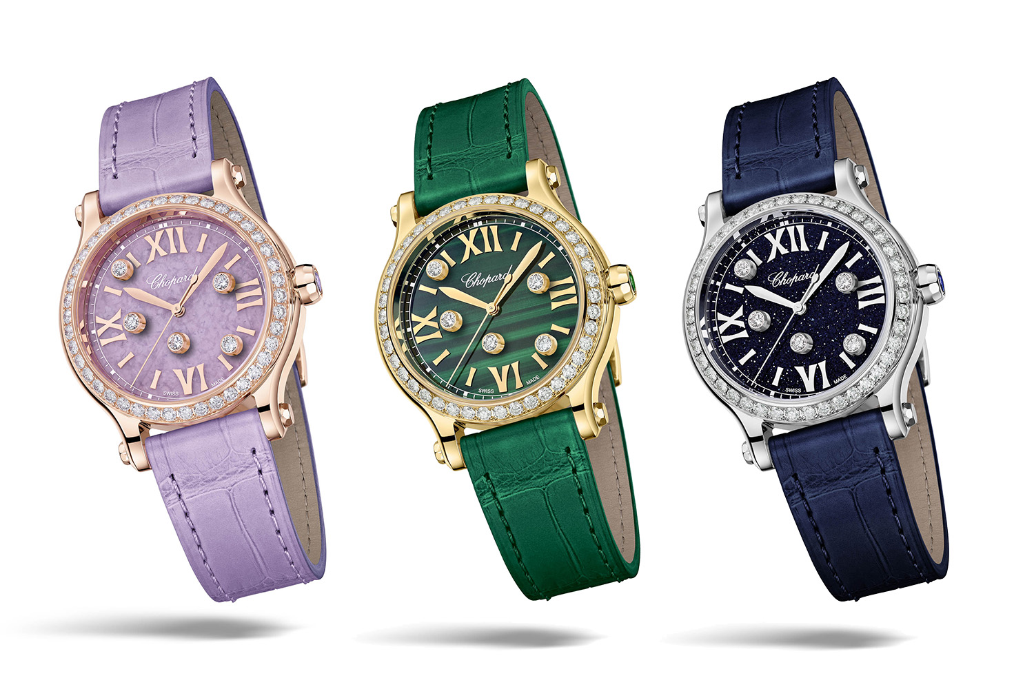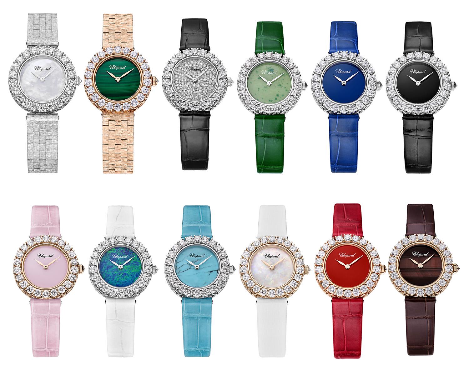 全新HappySport系列限量腕表,左起分别搭配锂云母、孔雀石及砂金石天然宝石装饰表盘