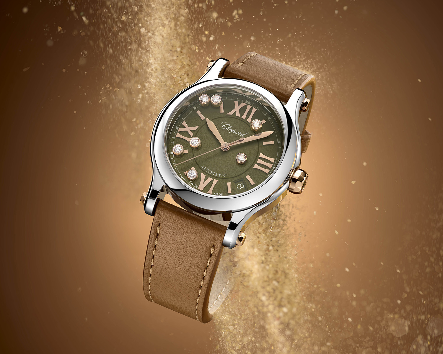 萧邦为其经典HappySport系列注入焕新华彩。全新HappySport系列36毫米自动上链腕表推出卡其绿色表盘。卡其绿色粒纹表盘与玫瑰金时标和指针相互映衬,表冠处玫瑰金与橄榄绿色碧玺交相辉映,LucentSteel精钢表壳搭配饰以米色缝线的哑光棕色小牛皮表带,整体色调如一片生机盎然的原野。