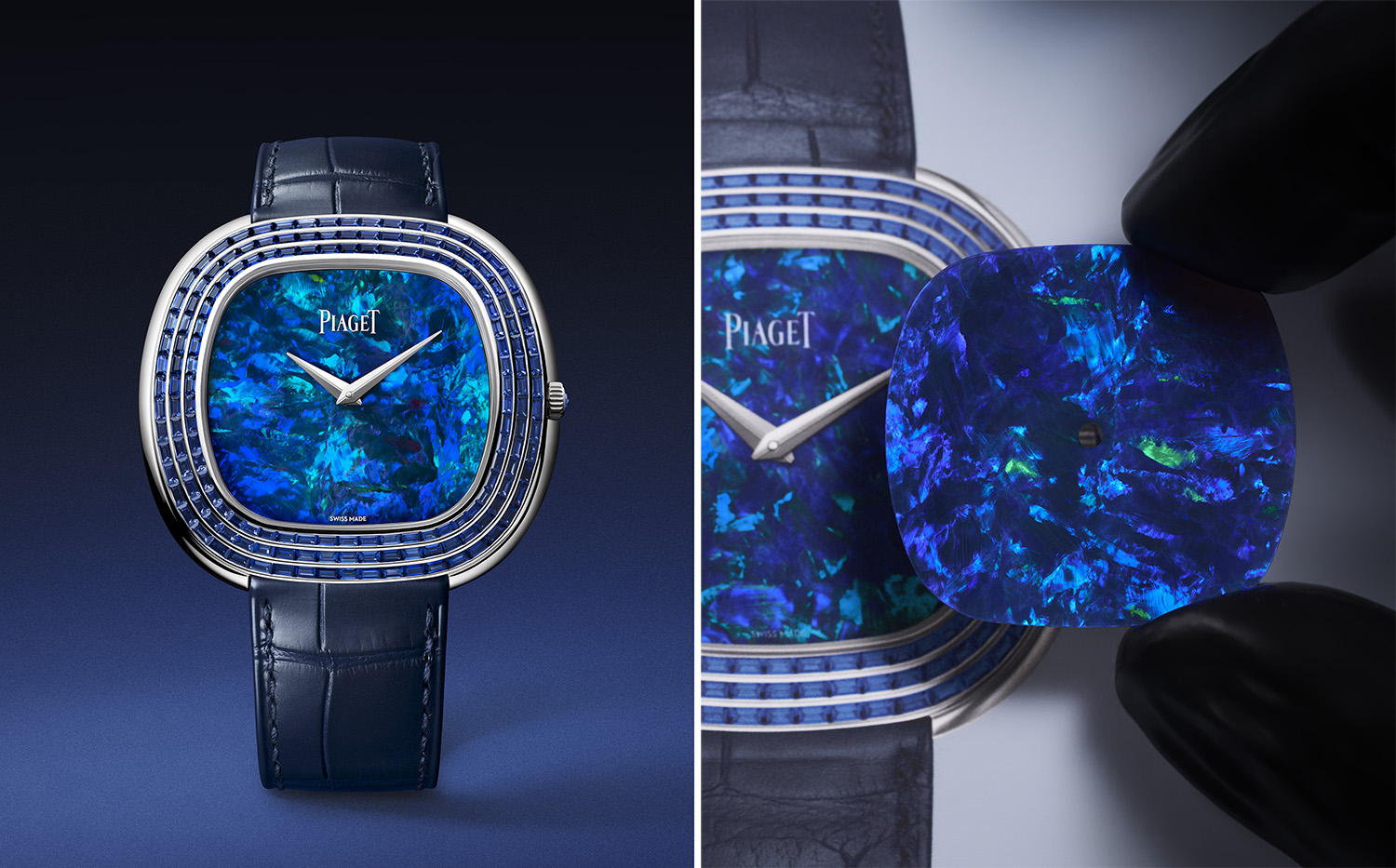 左:伯爵安迪·沃霍尔巴黎钉纹腕表,蓝色陨石表盘搭配18K白金表壳