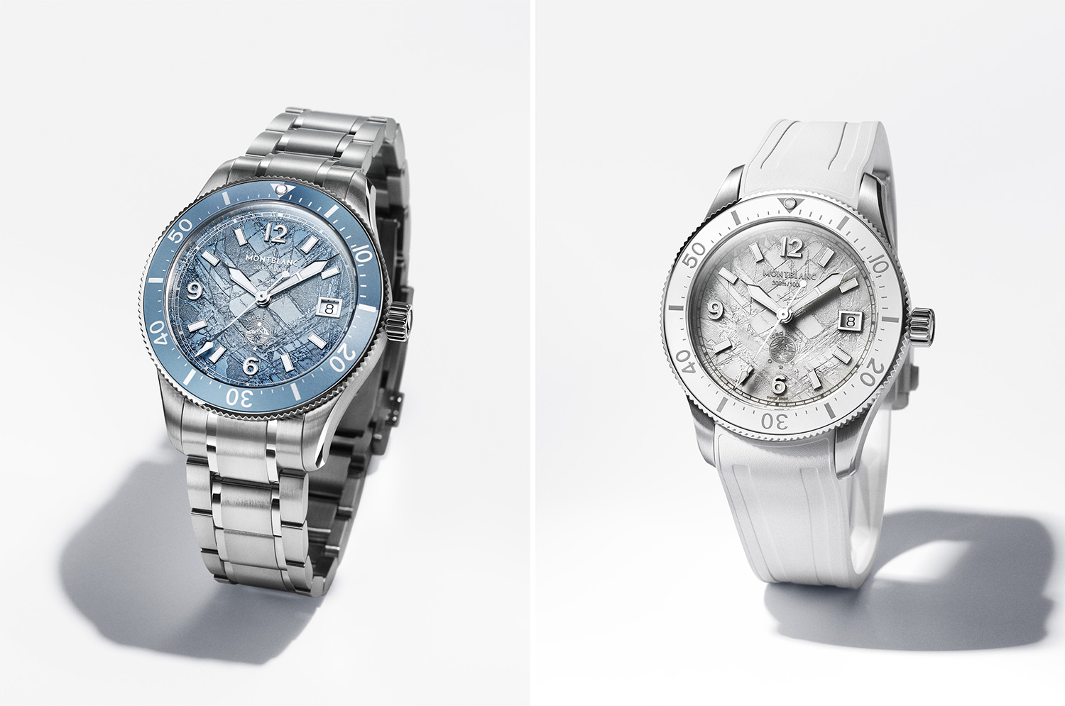 新款从此前的41毫米调整至38毫米的表壳尺寸,满足追求偏小表径腕表人士的需求。两款全新色彩为“冰川白”及“冰晶蓝”,这也是冰川系列潜水腕表首次推出纯白色表款。两款新作均提供可自行替换的V字形精钢表链和与表盘同色的橡胶表带两种选择,配有可调节装置。其中,橡胶表带经过全新设计,内侧饰有立体冰川图案,透气性和佩戴舒适感得到进一步提升。此外,41毫米表款亦推出全新的“冰岩灰”特别款,做旧精钢表壳搭配单向旋转黑色陶瓷表圈,并配备可自行替换的V字形黑色橡胶表带。