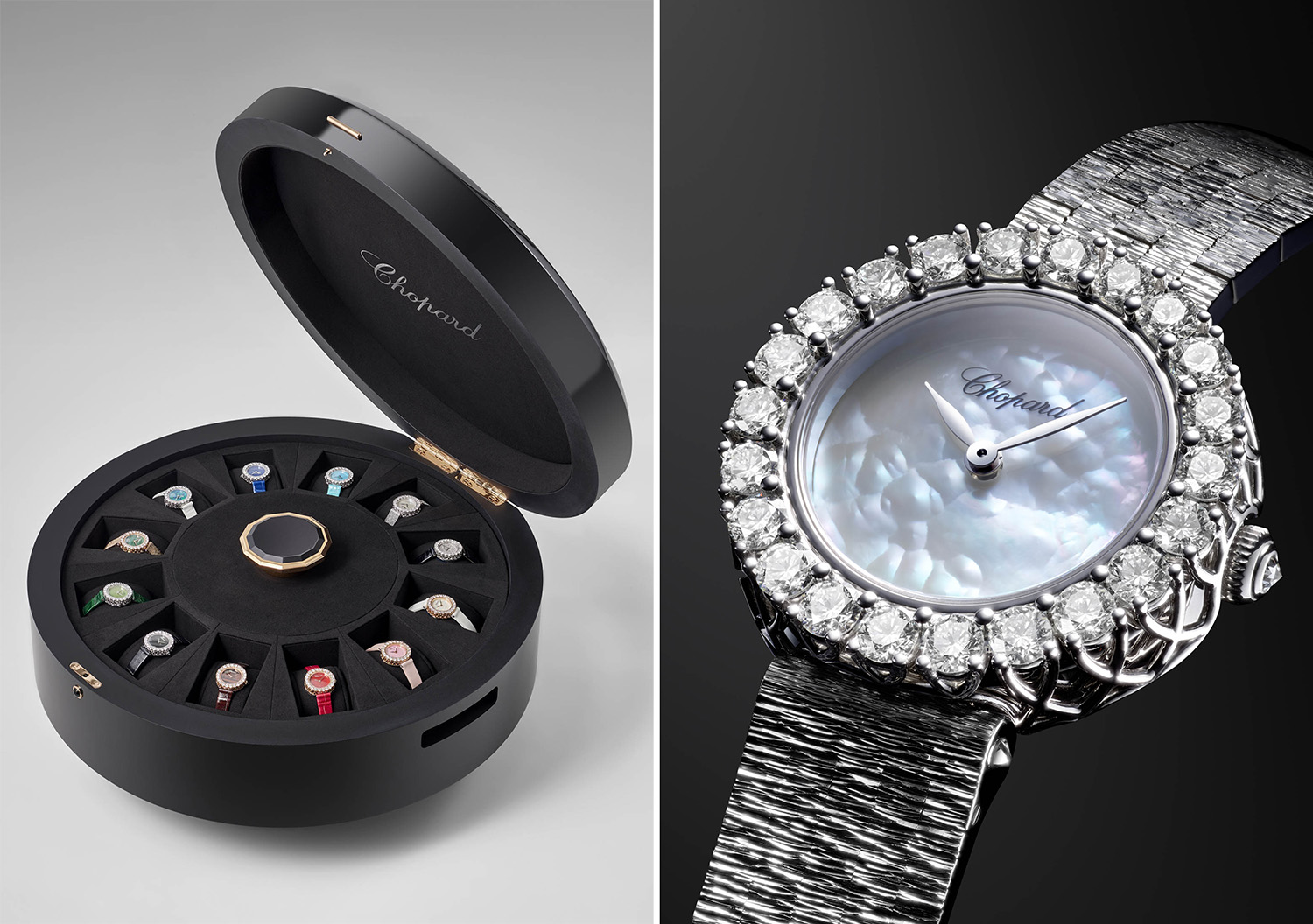 自上世纪60年代末,萧邦就开始打造各种天然彩色宝石装饰表盘。今年,品牌特意打造“珍贵时光”(ThePreciousHours)腕表套装,以10种不同的天然装饰宝石,推出12枚不同的L’HeureduDiamant系列26毫米表款,象征一年12个月和一天12个小时,典藏于搭载展示转盘的黑漆表盒之中。每款表盘皆蕴含美好寓意,材质包括珍珠母贝、钻石、红玉髓、虎眼石、缟玛瑙、孔雀石、绿松石以及粉色欧泊、玉石和蓝玛瑙。