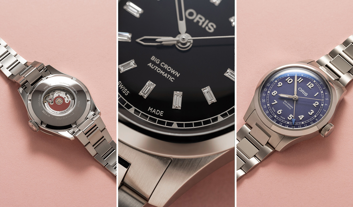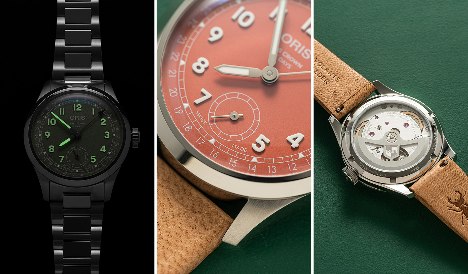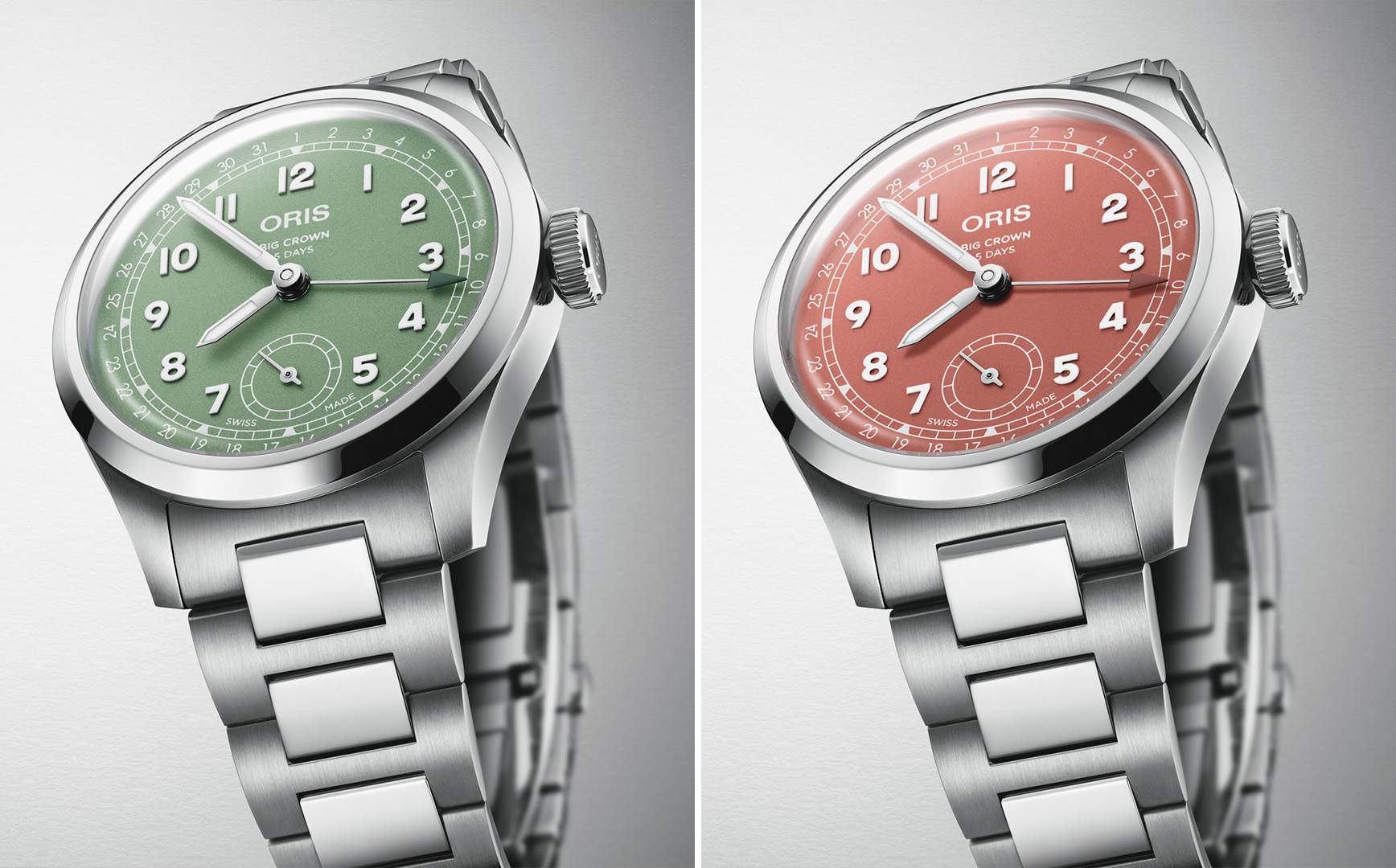 新作主要分为三大款式。豪利时将品牌最具标志性的Oris403自主机芯搭载于大表冠作品之中。该自动上链机芯具有五天动力储存、防磁、十年服务间隔和保修等性能优势,表盘6点钟位置设有小秒盘。这一新表款采用直径40毫米的不锈钢表壳,提供赤陶色或绿色两种表盘选择,均可搭配全新金属表链或环保⿅皮表带。