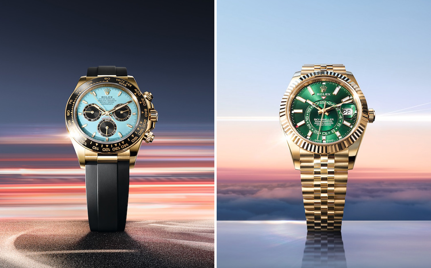 此外,品牌还为宇宙计型迪通拿18K黄金款和纵航者型18K黄金款打造新款表盘设计,前者推出绿松石蓝漆面表盘,配以亮黑色计时盘;后者搭配色调浓郁的太阳光线效果亮绿色表盘。